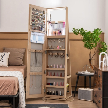 This jewellery cabinet is built with a full-length mirror, large inside storage space and storage shelves on the back, making full use of the limited space. And the inside space is divided into lots of storage partitions with hooks, slots and more, which helps you organize jewellery and cosmetics well. The base is 360° rotatable so you don’t need to be worried about taking items on the back storage shelves. More importantly, the mirror inside the cabinet is equipped with LED lighting that features 3 adjustable colours. And the folding acrylic table is convenient for placing makeup tools. The cabinet door is lockable with the included keys if needed. Made of premium MDF material, the stability and durability of this freestanding jewellery organizer are assured. Bullet Point: 【Keep All Your Jewelry Organized】: With 120 earring slots, 54 stud holes, 104 ring slots, 24 necklace hooks, 4 storage racks, 3 bracelet rods, 3 brush storage boxes, 12 lipstick compartments and 1 dust-proof storage pocket, this jewellery cabinet provides plenty storage space and keeps all the jewellery well organized. 【Higher Full Length Mirror Jewelry Armoire】: Enjoying the dual benefits of a jewellery armoire and mirror in one cabinet, this freestanding jewellery cabinet will give you endless fun in dressing up. Extended long mirror (155.5cm L x 37cm W) offers you a head-to-toe view of your outfit in the real image and you can store all jewellery in order with this jewellery armoire. 【3-Color LED Lights & Foldable Makeup Tray】: The LED strip around the internal makeup mirror will automatically turn on when you open the door, and the light can be switched to natural light, blue light and white light to meet your different makeup needs. (The light is powered by 3 AAA batteries, not included). Besides, the foldable makeup tray can be opened at any time to place your eyebrow brushes and lipsticks. 【360° Swivel Base & 3 Back Storage Shelves】: Enjoying the 360-degree swivel base, the mirrored jewellery organizer is more flexible to meet your different needs. 3 back storage shelve of the jewellery cabinet can store your handbag, books or other items, and they can also make the jewellery organizer more stable. 【Lockable Design & Velvet Lining】: The large jewellery armoire is lockable with 2 keys. So you can keep the private storage of your jewellery. Meanwhile, there are high-grade velvet liners inside to prevent your jewellery from being scuffed and scratched. Features: 3-in-1 design meets various needs and maximizes the space efficiency Designed with large and classified storage space for different storage needs Built-in a mirror and a folding acrylic table for convenient making up The inside mirror is equipped with auto-on and 3-color LED lighting The base is 360° freely rotatable according to your needs The cabinet door is lockable and 2 keys are included Features stable and durable structure made of premium MDF and hinges Easy assembly with included instructions Specifications: Colour: White/Brown/Coffee/Black Material: MDF, Plastic Overall Dimension: 54.5cm x 54.5cm x 161cm (L x W x H) Cabinet Dimension: 155.5cm x 37cm x 10cm (L x W x H) Net Weight: 22.5kg Package Includes: 1 x Jewelry Armoire 1 x User Guide Box Qty:1(May vary by batch)