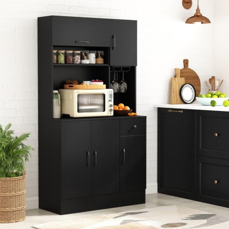 The combination of flip-up cabinet, open shelf, wide countertop, and slide-out drawer keeps your kitchen essentials neatly organized. Featuring 3 adjustable shelves in the cabinets, this piece organizes everything from kitchenware to spice jars. Together with stemware rack, the pantry cabinet is a stylish solution to keep glasses accessible. Need to charge but the nearest outlet is far away? This cupboard is equipped with charging station for added convenience. Safety is considered with the inclusion of anti-tipping kits, ensuring the cabinet remains stable and secure. This freestanding buffet cabinet is an ideal addition to your kitchen or dining room, bringing a streamlined organization in an elegant way. Bullet Point:Abundant Storage Space: This pantry cabinet features a flip-up cabinet and an open shelf for easy access, paired with a wide countertop for organizing kitchen appliances. The built-in wine glass holder safely secures your stemware. Also, the convenient drawer, 2-door cabinet, and single door cabinet keep kitchenware and dinnerware organized. Flexible Storage Solution: The top cabinet comes with a 3-position adjustable shelf, while the bottom cabinets boast 5-position adjustable shelves, giving you the flexibility to customize storage according to your requirements. Convenient Charging Station: Stay connected while cooking or entertaining with a built-in charging station in this freestanding buffet cupboard. There are 2 outlets, 1 USB port and 1 type-C port for keeping devices powered and accessible. Use with Safety and Stability: Designed for stability and safety, the kitchen storage cabinet includes 2 anti-tipping kits to securely anchor it to the wall, making it a reliable addition to homes with children or pets. In addition, thickened base adds extra stability. Aesthetically Pleasing Design: This modern microwave cabinet complements any home style. Also, you can utilize it as a buffet cabinet in the dining area, a cupboard in your kitchen, or as a storage organizer in your living room, enhancing the aesthetic while providing practical use. Specifications:Colour: Black/Natural/WhiteMaterial: Engineered Wood, MDF, MetalOverall Dimensions: 90 x 39 x 167 cm (L x W x H)Inner Size of Drawer: 22.5 x 33.5 x 8.5 cm (L x W x H)Height from Tabletop to Ground: 80 cm2 Outlets: 220-240V/10A1 USB Port & 1 Type-C: 5V/3.1APower Cord Length: 145 cmWeight Capacity of Tabletop: 45 kgWeight Capacity of Open Shelf: 10 kgWeight Capacity of Drawer: 5 kgWeight Capacity of Shelf in the 2-Door Cabinet: 20 kgNet Weight: 48 kg Box QTY: 1(May vary by batch)Package Includes:1 x Pantry Cabinet1 x Instruction