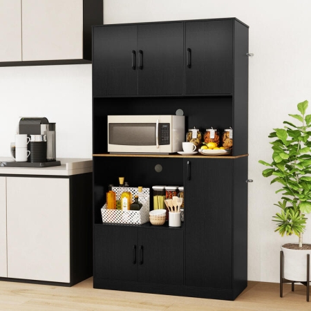 Designed to cater to all your storage needs, this large organizer includes spacious cabinets, compartment and wide countertop for different sizes of items. The built-in power strip is designed for effortless device charging. Crafted with well-designed details and robust construction, the storage cabinet promises stability and an orderly setup. Perfect for any kitchen, dining room, or living area, this pantry cabinet redefines modern home organization and aesthetic appeal. Built-in Power Strip: This tall pantry cabinet features a built-in power strip on the countertop, complete with 2 AC outlets, 1 USB port, and 1 Type-C port. The power outlet is perfect for charging devices right where you need them.Sufficient Storage Space: Designed with 2 double-door cabinets and 2 single-door cabinets, this kitchen cabinet offers space for food, dinnerware, kitchenware and wine. The spacious countertop and large storage compartment perfectly accommodate microwave, coffee machine, and other kitchen appliances.Robust & Safe Build: Equipped with 4 anti-tipping kits, this storage hutch ensures high-level stability and safety. Additionally, it features non-slip foot pads at the base, keeping the unit steady while protecting the floors from scratches.User-Friendly Design: Each cabinet door includes convenient handles and magnetic door catches for easy opening and closing. The cabinet also incorporates cable management holes to keep wires tidy and out of sight.Versatile Home Organizer: With stylish and practical design, this 180 cm tall pantry cabinet serves as an ideal organizer for kitchens, dining rooms, and living rooms. Enhance home organization and aesthetic appeal with this modern storage solution. Specification: Color:Black/White Material:Engineered Wood, MDFProductDimensions:100 x 40 x 180 cm (L x W x H)NetWeight:45.5 kg Box QTY: 2(May vary by batch)Is Assembly Required: Yes Package Includes: 1 x Tall Kitchen Pantry1 x Instruction