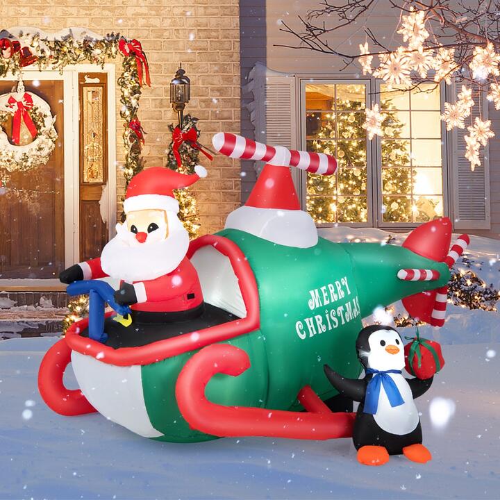 If you're looking for a quick setup Christmas product to decorate your yard, this Santa Claus Flying Airplane Inflatable Decoration is perfect for you. When the built-in LED lights illuminate your yard, it will attract the attention of your neighbour guests as well as passersby, and you will receive many compliments. Use stakes and tethers to secure it in your yard or lawn, and the lighted inflatable Christmas decor will make every night special. Bullet Point: Attractive Christmas Decoration: Santa Claus smiles benignly, driving the helicopter with a little cute penguin. Now they are coming to your town! The special appearance makes the inflatable decoration the highlight of your backyard, which will surely be loved by little kids! Realize Better Nighttime Effect: Our inflatable Christmas decoration comes with 3 built-in LED lights to make inflatable helicopters, Santa Claus and penguins more vivid and realistic. In addition, the lighted inflatable Christmas prop creates an even better Christmas Eve atmosphere. Quality Material for Durability: Adopted of reliable 190T polyester material, this outdoor blow-up decor is tear-resistant, anti-wear, and waterproof, coping with different weather conditions. Excellent stitching prevents air leaks, ensuring that it can be used for several years. Self-inflates In Just 50 Seconds: This Christmas blow-up decoration features a powerful blower that automatically inflates. Place the Christmas inflatable outdoor decoration on an open field and plug it in. In less than a minute, you'll enjoy the adorable inflatable Santa decoration. Super Stable for Outdoor Use: Our inflatable helicopter decor is equipped with built-in sandbags, stakes and ropes to hold them firmly to the ground for increased stability. Even if it is placed outdoors (yard or lawn), there is no need to worry about it being blown over by the wind. Features: Absorbing design with Santa & Penguin on Helicopter Built-in ultra-bright LED lights brighten up your yard Sandbag, stakes & tethers included for secure setup Great for indoor, and outdoor, parties, stage props and more 190T waterproof polyester fabric for many years of use Self-inflates in moments with attached external blower Unique Christmas decoration attracts neighbours & kids Specifications: Colour: As Shown Material: 190T Polyester Fabric Product Dimensions: 190 x 130 x 120cm (L x W x H) Net Weight: 1.6kg Inflation Time: 50 Seconds Package Includes: 1 x Inflatable Christmas Decor 1 x SAA Approved Adaptor 1 x Built-in Blower 4 x Ground Stakes 2 x Strong Ropes 1 x Internal Sandbag 3 x Bright LED Lights 1 x User's Manual Box Qty:1(May vary by batch) Is Assembly Required: Yes