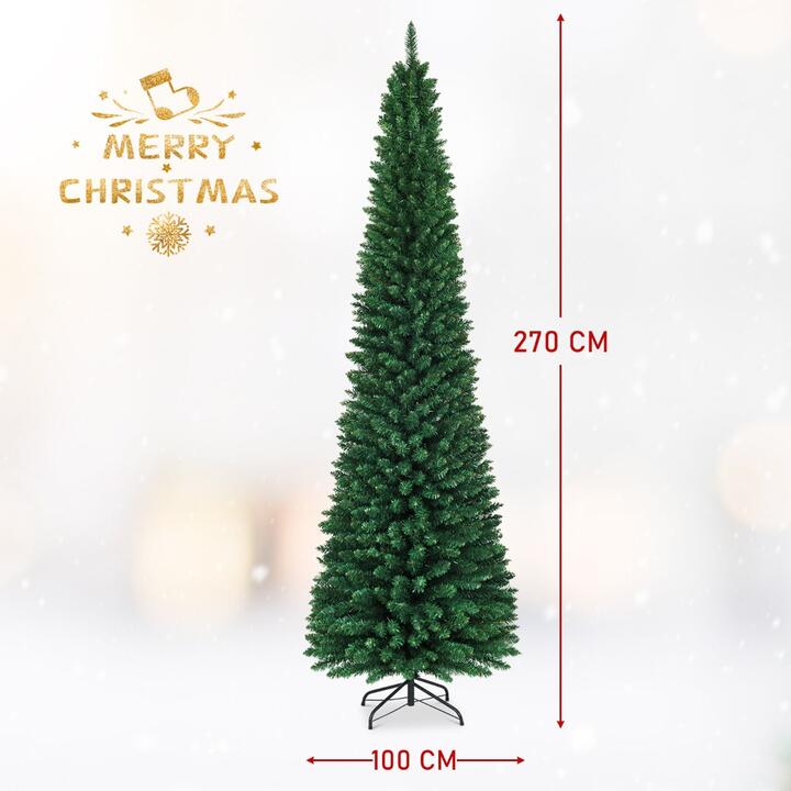This slim pencil Xmas tree makes a natural and realistic style decoration to your home, full of Christmas atmosphere. Thanks to its tall and slim pencil design, the artificial tree has a small footprint and is very suitable for small spaces and narrow corners. The PVC branches and leaves make the tree look denser and more eye-catching whenever placed indoor or outdoor places. The hinged branches fold outward, making setting up and disassembly quick and easy. 150/180/210/240 cm Xmas tree will stand tall and upright with the help of a sturdy metal base. Bring this charming accent home to create a festival warmth for your family. Bullet Point: Natural Pine Tree Appeal: With 220/400/700/1000 individually crafted branch tips to create a full-bodied look, this artificial Xmas tree mimics nature’s design for a life-life appearance that as charming as the real pine tree. And the strong branches can be hung with your favorite ornaments and holiday accents for the festival atmosphere. Space-saving Xmas Pencil Tree Decoration: Standing at 150/180/210/240 cm tall, this slim pencil tree is compact for display in some tight space or corners. Durable and stable features allows it to stay straight for outdoor and indoor us. A perfect decoration on Halloween, Christmas, parties or many other occasions to create holiday feel. PVC Material for Lasting Durability: Crafted with high quality PVC material, which offers fade-resistance, durability and flexibility, the artificial pine tree will endure many holidays. The Xmas tree decor is also fire-resistant and non-allergenic, making it a great accent piece wherever it is placed. Hinged Design for Easy Setup: Adopting a hinge system, the artificial pine tree is designed with 3 parts, with all tree branches are pre-attached at the center pole in preparation for its final shape. After each use, the slim Christmas tree can be easily taken down and stored for your next holiday season. Solid Folding Metal Legs: The four-legged bracket is made of metal, evenly stressed to improve the stability of the tree, keeping it stands tall and upright all the time. The stand also fold flat for your next use. Besides, the plastic feet pads at the bottom makes the tree not easy to slip and protect your floor from scratches. Features: Unique slim pencil design makes it a space-saving decoration in tight space Branch tips closely mimic nature’s design for a life-like appearance Quality PVC material is odorless, non flammable, and non allergic for safe use Solid metal base with non-slip feet keeps the tree stand tall without floor scratches Four-leg tree stand folds flat for convenient storage for next season use Hang some jingle bell, gift box, Christmas stocking decorations on the branches Convenient hinged sections allow for easy setup and disassembly Perfect indoor and outdoor decoration for home, hotel, office and so on Perfect gift idea for family or friends to share memorable happy hours Specifications: Color: Green Material: PVC + Iron Height: 150/180/210/240 cm Base wide: 60/65/75/85 cm Net weight: 2/2.7/4.6/6.3 kg Package Includes: 1 x Fir Pencil Christmas Tree 1 x Instruction Box Qty:1(May vary by batch)