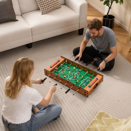 This 2 in 1 tabletop game table allows you to quickly switch between foosball and hockey, making it an excellent choice for versatile gaming action. Measuring 69 cm, it is compact enough to fit into any space while being light enough to move easily. This complete combo game set including 2 soccer balls, 2 pushers and 2 pucks is crafted to engage players of all ages. Whether you're hosting a party, spending a family night at home or having a break at the office, this combo game table is a fabulous addition. 2 in 1 Combo Game Table: This 2 in 1 tabletop game table allows you to switch games easily by flipping the game panel. It offers 2 game options for you and your family, including hockey and foosball.Complete Accessories: Equipped with 2 soccer balls, 2 pucks and 2 pushers, this combo game table is ready to play. Everything you need for thrilling tabletop action is at your fingertips, ensuring a great game time.Enhanced Play Experience: This foosball game table comes with anti-slip handles for better grip, realistic players for an authentic feel, manual scorers to keep track of the action, and handy goal boxes for quick retrieval.Compact & Portable Design: Measuring 69 x 35 x 10 cm (L x W x H) and weighing just 3.5 kg, this tabletop game table is easy to move and store. Whether it's set up in a game room, living room or brought along to parties, this table provides hours of play.Great for All Ages: Ideal for both kids and adults, this multi-game table not only offers endless competitive fun, but also helps develop hand-eye coordination, improve reaction ability and promote parent-child interaction. Specification:Color: Natural and Green Material: MDF, Stainless Steel, PlasticProduct Dimensions: 69 x 35 x 10 cm (L x W x H)Net Weight: 3.5 kgBox QTY: 1(May vary by batch)Is Assembly Required: Yes Package Includes:1 x 2 in 1 Game Table 2 x Soccer Balls2 x Pucks 2 x Pushers 1 x User Guide
