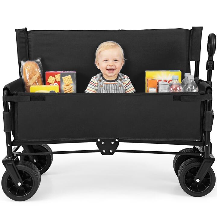 Designed for outdoor enthusiasts, this collapsible folding cart doubles as a bench, complete with soft sponge-filled back and seat cushions for added support. Its rugged metal frame combined with tear-resistant Oxford fabric ensures durability and stability. The all-terrain wheels allow smooth movement across different surfaces such as sand, grass, cobblestones, and even snow. Adding to its convenience, the handle offers both 90° rotation and adjustable height, providing enhanced control. Additionally, the beach wagon chair requires no assembly and folds effortlessly, making it an ideal companion for camping, picnics, and other outdoor activities. Bullet Point: Convertible Comfort & Portability: The foldable beach wagon converts into a bench, providing comfort with back and seat cushions featuring high-resilience sponge filling. With a foldable and portable design, it is perfect for beach trips, camping, picnics, and more outdoor events.Adjustable & Rotatable Handle: Featuring 90° rotation and height adjustment, the handle on this outdoor utility wagon offers optimal control and comfort. Whether navigating tight spaces or pulling over long distances, the customizable handle ensures a personalized fit that enhances your overall experience.All-Terrain Wheels for Mobility: The all-terrain wheels are wear-resistant and puncture-proof, capable of handling cobbled roads, grass, sand, and snow. Thanks to these 16.5 cm big wheels, the wagon bench seat combo serves as an ideal companion for your outdoor adventures.Stable & Reliable Construction: Crafted from tear-resistant, waterproof Oxford fabric, this 2-in-1 foldable beach cart is built to endure tough conditions. Its sturdy metal frame adds strength and stability, offering dependable support for frequent and demanding use.Easy Setup & Thoughtful Details: Ready for immediate use without assembly required, the folding wagon with bench includes side pockets for easy storage of your essentials. The hook and loop fasteners ensure secure attachment, while the reinforced base adds to overall steadiness. Specification: Color: BlackMaterials: Oxford Cloth, Metal, PP, PVC, Taffeta, SpongeDimensions of Wagon: 96 × 59 × 75-106 cm (L × W × H)Dimensions of Folding: 77 × 59 × 24 cm (L × W × H)Size of Seat: 82 × 43 cm (W × D)Backrest Height: 48 cmSeat Height: 48 cmDiameter of Each Wheel: 16.5 cmNet Weight: 12.5 kgWeight Capacity: 80 kgBox QTY: 1(May vary by batch)Is Assembly Required: Yes Package Includes: 1 × Wagon Bench Seat Combo1 × Instruction