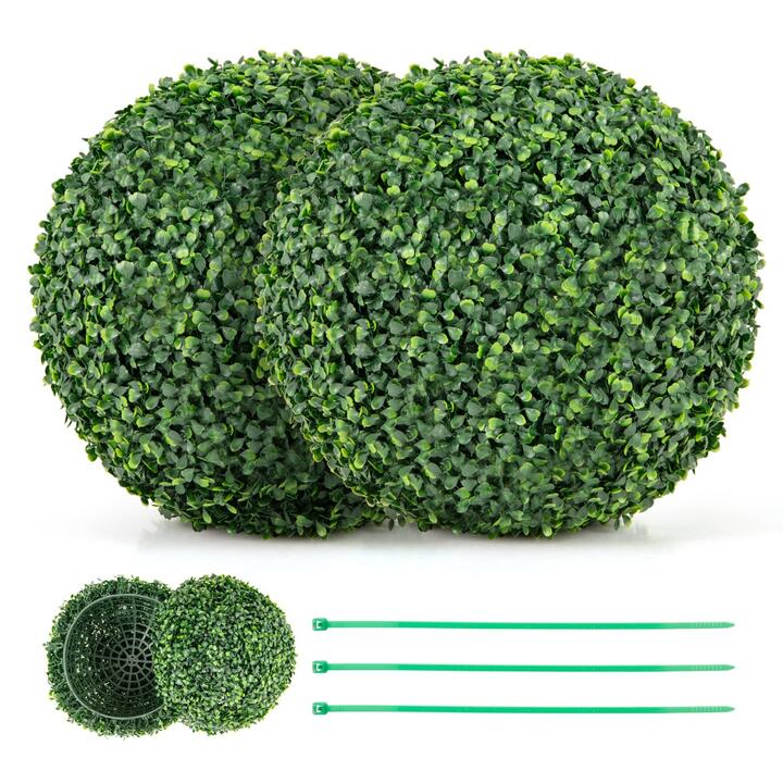 Enhance your home or event decoration with this elegant set of 2 PCS artificial plant milan grass balls. These 39 cm/50 cm decorative plant balls are adorned with meticulously crafted milan grass leaves arranged in 4 layers, creating a lifelike and vibrant appearance. Besides, the faux leaves are crafted of high-quality PE material, which is not only odorless and safe but also resistant to sun and water, ensuring long-lasting durability without fading. Installation is also a breeze with the convenient interlocking connectors and zip ties, allowing for quick and secure assembly within seconds. Moreover, these decorative spheres are perfect for both indoor and outdoor settings, such as living rooms, front doors, patios, gardens, offices, commercial areas, weddings, etc. Bullet Points:Vivid and Natural Appearance: This artificial plant set includes 2 milan grass balls measuring 39 cm/50 cm in diameter. The plant balls feature 4-layer bushy leaves in different shades of green, creating a full-bodied and natural appearance. Premium and Maintenance-Free Material: Crafted of premium PE material, the artificial milan grass ball is sun-protective, fade-resistant, non-odor, and non-allergic, ensuring long-term use. Moreover, the faux leaves require no watering, trimming, sunlight, or fertilizer. Easy to Install: Each milan grass ball comes in 2 halves and features interlocking connectors for effortless set up. All you need to do is connect the clip, tie the zip tie to the gap, cut off the excess part, and then place it on a suitable vase. These 39 cm/50 cm faux plant decorative balls are suitable for square and round flowerpots with 20-25 cm, 25-35 cm top openings. Indoor and Outdoor Decoration: Whether you want to add a touch of lush greenery to your garden, patio, balcony, or front porch, or enhance the ambiance of your living room, office, dining area, entryway, or special events, these topiary balls could add a touch of natural beauty to any space. Warm Tips: To revive the product from any compression during transportation, placing it in the sun or gently blowing it with a hair dryer will help it regain its original shape. Besides, if leaves fall off, just stick them back in without any hassle. Specifications:S:Colour: GreenMaterial: PEInner Diameter: 30 cmOuter Diameter: 39 cmSuitable Diameter of Flowerpot: 20-25 cmNet Weight of 2 Balls: 2 kgM:Colour: GreenMaterial: PEInner Diameter: 40 cmOuter Diameter: 50 cmSuitable Diameter of Flowerpot: 25-35 cmNet Weight of 2 Balls: 3 kg Package Includes:2 x Artificial Topiary Ball20 x Zip Tie Box Qty:1(May vary by batch)