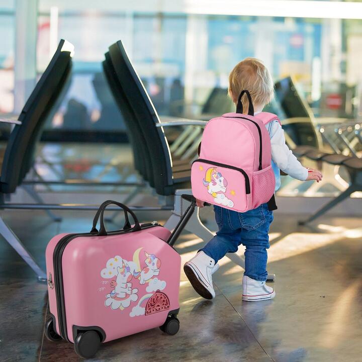 The Ultimate Travel Companion for Your Kids' Adventures! This luggage set includes an 18" hardshell suitcase and a 12" backpack, which are airline-approved carry-on. It also provides ample and classified storage space to meet all travel needs, such as toys, clothes, snacks, books, toiletries, etc. Designed with versatility in mind, this suitcase can not only be pulled to move but also allow your kid to sit on and ride on, offering a fun and innovative way to travel. It is equipped with a multipurpose rope for pulling and preventing loss, which can be connected to the suitcase or the backpack. Furthermore, it comes with a detachable carrying strap, allowing you to easily carry it when rushing to the car or check-in gate. Thanks to the retractable handle and spinner wheels, kids can easily move it around alone. Safety is our top priority, which is why our suitcase is made from anti-scratch PC and ABS materials and it adopts a solid aluminium rod, providing durability and stability. And let's not forget the stylish and adorable patterns that add a touch of fashion to your travel gear. BulletPoint: Ample and Organized Storage Space: The 2 PCS kids' luggage set includes an 18" ride-on hardshell suitcase and a 12" backpack, which is suitable for various activities, such as school, picnics, short trips, and more. In addition, the suitcase features a zippered storage pocket and inside cross straps, and the backpack comes with 2 storage compartments, providing ample space for classified storage. Also, there exist 2 side mesh pockets for storing water bottles. Multifunctional Design: This hardshell suitcase offers versatility for different situations. It features a sit-on and ride-on design with foldable footrests, therefore kids can sit on it when stuck in long lines, providing a comfy sitting experience. The pull-to-move design saves labour, making it easy to move around. And the carry-on design complies with airline restrictions, making it a convenient travel companion. Moreover, the luggage set can be carried over the shoulder or in the hand for convenience. Multipurpose Rope and Adjustable Carrying Strap: The children's luggage set includes a multipurpose rope, which can be used as a pull rope to move the suitcase or used as an anti-lost rope to attach to the backpack. In addition, it comes with a 67-130 cm adjustable carrying strap, which is suitable for kids or adults of different sizes and shoulder widths. Spinner Wheels and Retractable Handle: The hardshell suitcase has 2 front universal wheels and 2 large back wheels, which are silent and smooth, allowing for effortless maneuverability. Besides, it features a 3-level retractable handle, catering to different heights. And it only weighs 2.5 kg, which is lightweight, thus it is easy to move and carry. Safe Material and Cute Appearance: The hardshell adopts are waterproof and anti-scratch ABS shells, the pulling rod is made of solid and lightweight aluminium, and the backpack is made of tear and wear-resistant PU fabric, ensuring good durability and protection against the elements. Other than that, with its cute patterns and funny shapes, this luggage set can be a perfect gift for kids over 3 years old. Features: 4-in-1 multifunctional design: sit-on, ride-on, pull-to-move, and carry-on Perfect size to put in the overhead compartment of the plane or under the seat Designed with 130 cm anti-lose rope for pulling a suitcase and preventing loss Designed with a detachable carrying strap and portable handles, easy to carry around The carrying strap length can be adjusted from 67 cm to 130 cm, to meet different needs Comes with compartments in the suitcase and backpack to classify travel essentials The sit-on suitcase provides comfortable sitting and features convenient footrests The aluminium 3-level retractable handle can be adjusted to suit kids of different heights 2-way smooth zippers with lock holes are designed to ensure security when travelling The wide shoulder straps with adjustable strap buckles help reduce the burden on kids' shoulders The shoulder straps with a safety buckle would not swing up and down when walking Comes with stretched mesh bottle pockets, provide easy access for bottles Made of safe and durable ABS shells, the sturdy kid suitcase ensures long-term use, waterproof and wear-resistant Equipped with rotatable wheels and a 3-level retractable handle for easy movement Specifications: Colour: Flamingo/Unicorn/Dinosaur Material: ABS, PU, Fabric, Aluminium Size of the Ride-on Suitcase: 47 x 23 x 38 cm (L x W x H) Retractable Handle Height from the Ground: 76 cm Size of the Backpack: 26 x 30 cm(L x H) Length of the Carrying Strap: 67-130 cm Length of the Anti-Loss Rope: 130 cm Weight Capacity of the Ride-on Suitcase: 50 kg Capacity of the Ride-on Suitcase: 8 kg Recommend Age: 3+ Years Old Net Weight: 2.5 kg Package Includes: 1 x Ride-on Suitcase 1 x Backpack 1 x Anti-Loss Rope 1 x Carrying Strap Box Qty:1(May vary by batch)