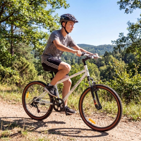 Our kid's bike comes in 2 wheel sizes (20"/24"), catering to children aged 8+ years old, expertly designed to handle diverse terrains with ease, complete with a 6-speed drivetrain, perfect for a smooth transition between various surfaces, from leisurely park rides to exciting hill climbs. It features a front suspension fork and large pneumatic tires, providing a cushioned ride on trails and city streets, ensuring your child's comfort and safety. Furthermore, with reliable front and rear V-brakes, young riders can safely navigate their journeys with ease. Both seat and handlebars are adjustable to grow with your child, ensuring a comfortable and ergonomic riding position. Gear up your young cyclist with this sturdy and versatile mountain bike for endless outdoor fun! Advanced Suspension System: This kids bike is equipped with a front suspension fork that offers advanced shock absorption, ensuring comfortable riding on rough terrains. Plus, its large pneumatic tires with a scientific pattern and strong grip, ensuring a stable and safe riding experience. Smooth Shifting Experience: The bicycle features a Shimano 6-speed drivetrain, allowing for simple shifting and easy climbing by just a twist to change gears. It is ideal for mountain excursions and leisurely rides, though not intended for off-road or competitive biking activities. Dual Braking System: The mountain bike is fitted with reliable front and rear V-brakes, which offer secure and sensitive stopping power, allowing for quick and efficient stopping. In addition, the handbrake design with a shorter distance, accessible for smaller hands. Designed for Children: Available in 20" and 24" sizes, this bike caters to children and teenagers aged 8+ years old. Both the seat and handlebar heights are adjustable, ensuring a perfect fit as your child grows. Please measure the kids inseam and compare it with the saddle height of this bicycle. Consider the ride height more than age.Note: Please refer to the table in the picture for detailed data. Pre-Assembled Convenience: This bike arrives 85% pre-assembled for easy setup. Simply follow the instructions to attach the handlebars, seat, front wheel, pedals, and reflectors. Brake installation is required, and detailed instructions are provided in the manual. Specification: 20"Color: Blue/Black/Navy/WhiteMaterial: Metal, PlasticWheel Size: 50 cmProduct Dimensions: 142 x 57 x 89 cm (L x W x H)Suitable Rider Height: 122-152 cmSuitable Age: 8+ Years OldWeight Capacity: 50 kgNet Weight: 13 kg24"Color: Blue/Black/Navy/WhiteMaterial: Metal, PlasticWheel Size: 60 cmProduct Dimensions: 162 x 57 x 102 cm (L x W x H)Suitable Rider Height: 142-168 cmSuitable Age: 8+ Years OldWeight Capacity: 50 kgNet Weight: 14.5 kgBox QTY: 1(May vary by batch)Is Assembly Required: Yes Package Includes: 1 x Kids Bike1 x User's Manual