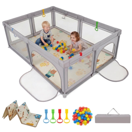 The baby play yard provides a large and safe playground for the baby to crawl and play on their own, so the parents can spare some time to do their stuff. The play area is large enough, and both you and your little one will enjoy immense comfort together. What's more, the soft play mat protects your little ones from any slips, falls, or bumps. You can put the included 50pcs ocean balls in the playpen to turn it into a fun playground that would keep the babies entertained. The external gate zipper design allows you to interact with your baby. With a sturdy steel structure and 4 suction cups, the playpen is hard to move and tip over. Our lightweight playpen is portable and easy to set up so that it can turn anywhere into a safe and fun play space. Bullet Point: Attribute: Spacious playpen: This 206 x 147 x 68.5 cm playpen creates a spacious play and rest area for your baby. This playpen shields the baby from danger and ensures its safety. The height of 68.5 cm prevents the baby from climbing out of the playpen. Safe materials: The baby gate is made of high-quality oxford fabric that is non-toxic and odourless, hard-wearing, waterproof and easy to clean. The tubular iron frame ensures the stability of the baby gate and prevents it from collapsing. The suction cups on the bottom hold the baby hutch securely to the floor. Practical design: The mesh on all sides not only promotes air circulation but also allows parents to observe the baby's behaviour from outside, which further increases safety. Two zippered doors allow easy access to the playpen. An outside zip prevents the baby from opening it from the inside. Additional accessories: This playpen comes with a soft mat so you do not need to buy an additional mat for this playpen. We have also included 50 colourful sea balls for babies to play with easily. A carry bag makes it easy to transport this playpen. Versatile use: The baby playpen is easy to assemble with step-by-step instructions. Parents can play with their baby in the playpen to encourage bonding. This playpen is suitable for children aged 0-3 years. You can place it in the living room, nursery and other places. Features: Soft play mat protects baby from any slips, falls, or bumps A carrying bag makes it easy to transport this playpen 50 ocean balls create a more interesting using experience 360 ° wide-angle field of view allows interact at any time External zippers prevent the baby from accidentally climbing out and falling 68cm height panel is suitable for the baby to learn to stand and walk 210D oxford material ensures the long service life Premium iron material and non-slip foot mats make the structure stable Free up your hands while giving your babies an independent space Specifications: Colour: Grey/Dark Grey/Blue Material: Oxford Fabric + PP + Iron Net Weight: 8 kg Product Dimensions: 206 x 146 x 68 cm (L X W X H) Play Mat Dimensions: 200 x 140 x 0.8 cm (L X W X T) Applicable Age: 0-3 years Package Includes: 1 x Baby Playpen 1 x Play Mat 50 x Ocean Balls 1 x Carrying Bag 1 x User Manual Box Qty:1(May vary by batch)