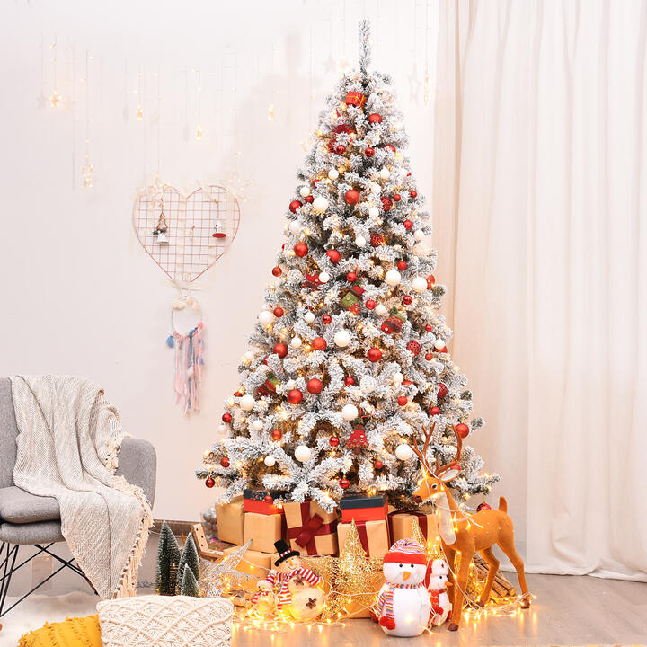 Our pre-lit Christmas tree is an ideal choice to imbue your home with holiday atmosphere! With 1010 branch tips and snow-flocked leaves, this tree looks just like a real tree perfectly kissed by snow, making it an eye-catching decoration during the holidays. It is crafted of non-flammable PVC material, which is resistant to pressure and not deformed easily for a long lifespan. Iron stand makes the tree stable without tilting. What's more, the branches are connected to the trunk by hinges to set up effortlessly in a short time. 450 LED lights will add a warm and charming feeling, bringing vitality to the room. It is perfect for home, office, shop and more. Bullet Point: Selected PVC with Snow Flocked Design: This lush Christmas tree is made of environmental-friendly and non-flammable PVC material, which is harmless and safe to use. Besides, the leaves with realistic flocked snow create a unique winter feeling, making the whole tree leafier and fluffier.Pre-lit LED Lights: This Christmas tree is equipped with 450 LED lights with warm white color, which is energy-efficient and long lasting. And SAA certified adapter is safe to use. Glowing warmly from our centerpiece tree's branches can provide the perfect brightness, creating a soft and calm mood for the room.Easy to Assemble with Hinged Design: In a few simple steps, this Christmas tree with 4 sections is easy to assemble, disassemble and store. And the hinged branches will expand easier to save your time and energy. Just arrange it a little, hang the decorations, and a beautiful Christmas tree is finished.Dense Branches for Versatility: With 1010 branch tips and snow flocked leaves, this full-bodied Christmas tree is like a real tree covered with snow. The 225cm stereoscopic tree is an attractive addition to blend perfectly with the winter scenery. It is ideal for home, shops, schools, etc.Sturdy Metal Stand: Compared with other cheap plastic base, our reinforced metal stand will provide the tree with greater support and ensure good stability. Foldable X-shaped stand can keep the tree standing upright and prevent the tree from falling. And non-slip foot pads can protect the floor from scratches. Features: 1010 branch tips for leafy and realistic appearance450 LED lights to create warm festival atmosphereSnow-flocked leaves for an eye-catching decorationEnvironmental-friendly PVC material, crush resistant and durableSturdy metal stand with antiskid foot caps to ensure stability and balanceIdeal for home, office, shops, school, etcSAA certified adapter ensures use safetyCome in 4 tree trunks with hinged design for quick assembly and easy storage Specifications: Colour: Show in the picture Material:PVC + Snow Flocked + Iron Tree Height: 225cm Diameter of Stand: 50 cm Number of Section: 4 Number of Branch Tips: 1010 Number of LED Lights: 450 Net Weight: 11.5kg Box Qty:1(May vary by batch)