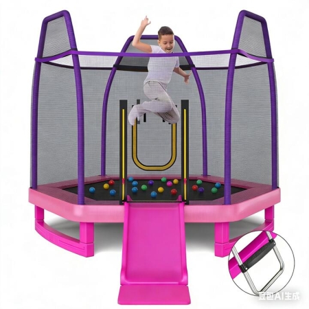 The 3-in-1 design hexagon trampoline that comes with a slide, ladder, oceans balls and safe anti-collision mat is a great entertainment for kids during home break. It encourages kids to bounce off some excessive energy, keeping away from screens and networks. There are soft-wrapped columns and dense ventilated enclosure for protection. Moreover, there's no gap between the jumping mat and the springs to eliminate pinching hazard. Besides, hot-dip galvanizing technology is adopted to grant excellent durability and high load bearing capacity to the frame, and the widened U-shaped legs keep the trampoline standing stably. Thus, feel free to use the trampoline in the backyard, playground or any other scenario. Bullet Point: Have Fun Bouncing, Sliding and Climbing: The bonus features of a funny slide and ladder make the 3-in-1 trampoline even more interesting for kids to exercise and play. There are 20 ocean balls added to the jumping area for extra fun and an anti-collision mat for a safe landing. Safety Comes First: To protect kids from accidental injuries, the toddler trampoline is equipped with a 56" tall all-around protective net and safe columns with anti-collision foam sleeves. What's more, the waterproof PVC mat with soft EPE cushioning covers springs for a safe gap-free surface. Hold up to 200 KG: The kid's trampoline boasts a 200 kg weight capacity thanks to the hot-dip galvanized steel frame and wider and sturdier U-shaped legs. Meanwhile, the premium material and advanced technology also make the trampoline suitable for indoor & outdoor use. Easy to Set up: The 223 x 223 x 186 cm trampoline comes with detailed instructions and necessary tools for easy assembly. Springs are connected to the jumping mat by special rings that are not easy to slip. And the door curtains can be unzipped from both sides and rolled up for easy entrance. Great Gift for Kids: Featuring a high-resilient PP jumping mat and 36 strong springs, the fitness trampoline provides a fantastic bouncing experience for kids aged 3+ years old, offering a good opportunity to build up strength, improve the sense of balance and promote bone growth. Features: A ladder with anti-slip steps makes it easy for kids to climb up and down 20 ocean balls included to bring kids more fun Fitted with slide and floor mat for safe sliding A protective enclosure net prevents kids from falling off Gap-free design protects kids from being pinched Steel tube with protective lubricating coating, hot-dip galvanized layer and reinforcement layer Wide U-shaped legs enhance stability and prevent tipping over Roll-up curtains with dual-sided zippers allow easy access A durable and soft PP mat offers a bouncy surface Thick and rustproof springs offer a longer lifespan Anti-slip off-spring rings allow for easy assembly and maintenance Specifications: Color: Blue + Yellow/Green + Yellow/Pink + Purple Materials: Galvanized Steel, PP, PVC, PE, EPE Dimension of Trampoline: 223 x 223 x 186 cm (L x W x H) Size of Slide: 39.5 x 42.5 cm (W x H) Size of Ladder: 45 x 33 cm (L x W) Size of Floor Mat: 39 x 30.5 cm (L x W) Spring Diameter: 22 mm Spring Length: 146 mm Tube Thickness: 1.5 mm Net Weight: 29 kg Static Weight Capacity: 60 kg Max Weight Capacity: 200 kg Recommended Age: 3+ Years Old Package Includes: 1 x Trampoline with Slide and Ladder 1 x Floor Mat 20 x Ocean Balls 1 x Instruction Box Qty: 1(May vary by batch)