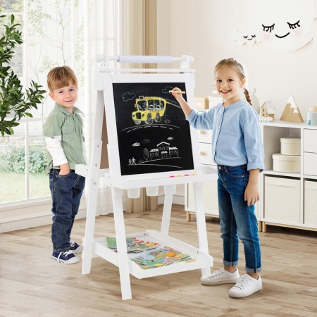 With magnetic whiteboard, magnetic chalkboard and drawing paper roll, kids can attach magnetic stickers or simply practice drawing, painting, writing and spelling. Built-in metal clip helps to fix the paper. Adding to its practicality, this easel includes spacious storage trays that keep painting and drawing tools neatly organized and easily accessible. Adjustable in 2 heights, the standing art easel is suitable for children of different ages. And sturdy A-shaped wooden frame ensures it remains stable during use. Whether your child is stepping into the world of colors for the first time or refining their artistic talents, this easel is a perfect choice to light up their creative world. Bullet Point: 3 in 1 Kids Art Easel: The easel for kids consists of magnetic whiteboard, magnetic chalkboard, and drawing paper roll, which lets kid’s imagination go wild by using different painting surfaces. Whether it's chalk, markers, or paint, this easel accommodates it all. Adjustable Heights: The wooden toddler easel can be set at 2 heights to accompany your kid’s growth: minimum height of 115cm for 3-5 years old, maximum height of 146cm for 6-10 years old. And all adjustments can be simply achieved through the height adjustable knob. Convenient Storage: There are 2 convenient storage trays on both sides, so that kids can place markers and brushes, magnetic stickers, paint cups and pots, chalks, erasers, toys and more. Plus, 4 paint cups are included to hold painting brushes. Reliable Construction: Mainly crafted of solid pine wood frame with excellent craftsmanship, the kids standing art easel is built to last. Stable A-shaped structure ensures it won’t wobble during use. With top built-in metal clip, the drawing paper can be securely fixed in place. Educational Toy Gift: Complied with EN71 and CPSIA, our double-sided easel will be a wonderful gift toy to complete the children’s hands-on learning experience. Note: Please tear off the protective films on both surfaces before use. Specifications: Colour: Natural Material: Pine WoodProduct Dimensions: 43-54 x 55 x 115-146 cm (L x W x H)Size of Chalkboard/ Whiteboard: 49 x 49 cm(L x W)Size of Paper Roll: 5 m x 44 cm(L x W)Suitable Age: 3-10 Years Old Recommend Height: 80-155 cmNet Weight: 4.5 kg Box QTY: 1(May vary by batch)Package Includes:1 x Kids Easel4 x Paint Cups1 x Paper Roll1 x User Manual
