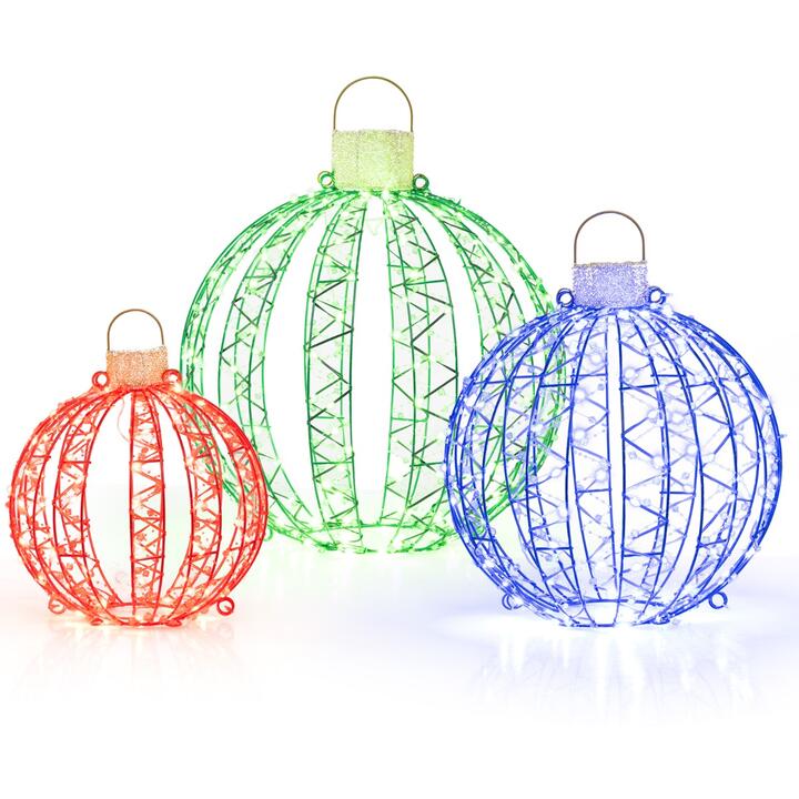 This 3-color Christmas light globe with red, blue and green LED lights (part of them are flashing), creates a strong holiday atmosphere, not only for Christmas, but also for Thanksgiving, Halloween and wedding parties. You can hang the Christmas light balls or place them on the ground, perfect for living room, porch, store, park and other indoor and outdoor scenes. You can also enjoy the benefits of well-made details, the gold hanging rings are beautiful and convenient, and the sturdy metal frame is built-to-last. Meanwhile, the easy-to-install Christmas light balls allow you to decorate your space with ease. Bullet Point:3-Color Lights: Featuring red, blue, and green lights, this 3-pack Christmas light balls set adds a strong Christmas atmosphere to your space. The bright lights, part of them are flashing, illuminate the dark night and set the holiday mood. Flexible Use: There are 2 ways to use the Christmas light balls for you to choose. The light balls can be hung and displayed like a lantern. You can also place the light balls on the ground with U-shaped nails for sidewalk decoration. Wide Application: Whether it's your living room, porch, store or park, these lighted sphere balls can bring you a perfect holiday atmosphere, which is the ideal decoration for Christmas. Plus, not only for Christmas, the light balls can also be used as a beautiful decoration for Thanksgiving, Halloween or wedding parties. Well-Made Details: The lighted Christmas balls come with golden hanging rings, which are not only beautiful in appearance, but also convenient to hang. And supported by a sturdy metal frame, not only not easy to deform, but also waterproof and rustproof, perfect for outdoor use. Easy Installation: According to the clear instruction and simple steps, the hanging Christmas ball ornaments are labor-saving to install. Simply connect the 2 hemispheres with straps, then attach the hanging rings in the same way and the Christmas light globes are done. Specifications:Colour: Red, Blue, GreenMaterials: LED, Metal, Cloth, PlasticDimension of Small Ball: 31 x 31 x 33 cm(L x W x H)Dimension of Middle Ball: 41.5 x 41.5 x 44.5 cm(L x W x H)Dimension of Large Ball: 51 x 51 x 56 cm(L x W x H)Net Weight: 3.5 kg Package Includes:1 x 3 Pack Christmas Light Balls6 x U-Shaped Nails30 x Straps1 x Adapter1 x Instruction Box Qty:1(May vary by batch) Is Assembly Required: Yes