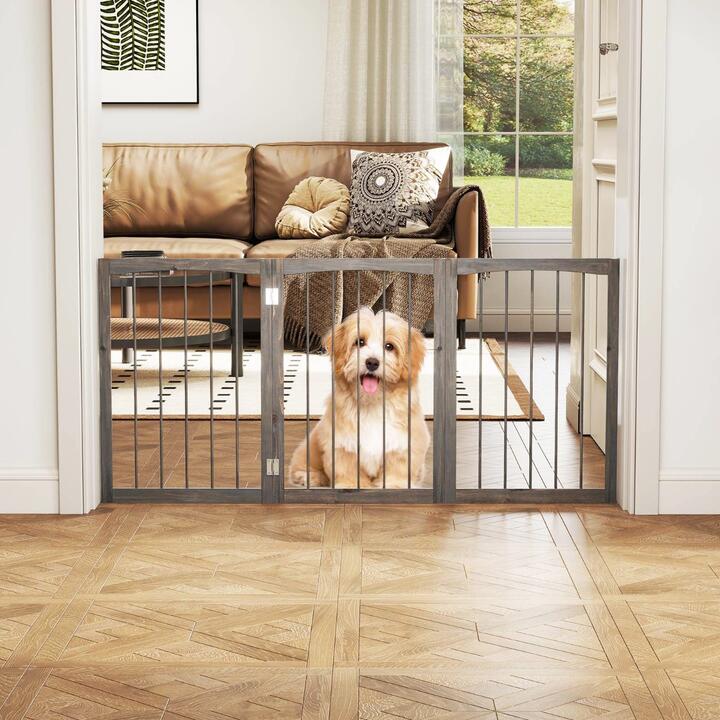 Our freestanding pet gate includes 3 flexible panels that allow for easy customization in various shapes and expansions, adapting to different room sizes and layouts effortlessly. It can be set in I, U, or Z formations to suit doorways, hallways, or any areas where you need to contain or protect your pets. Crafted from 100% natural fir wood, this robust gate not only secures your pets effectively but also complements your interior decor seamlessly. When not in use, the gate folds into a compact 4 cm profile, making storage simple even in tight spaces. Our wooden fence requires no installation, avoiding any potential damage to your walls. Opt for this dog gate to ensure pet safety while maintaining a tidy and stylish home environment. Bullet Point: Versatile Application: Whether you're looking to protect certain areas, create boundaries, keep pets away from potentially dangerous zones, or curb furniture damage, this pet gate is designed to meet your diverse needs. It is ideal for porches, doorways, hallways, bedrooms, kitchens, stairs, and more. Flexible 3-Panel Configurations: The dog gate includes 3 panels with flexible hinges, which allow for 180° free rotation. Easily configure it in I, U, or Z shapes to fit different spaces or expand it by adding more panels to customize the barricade area. Solid Wood Construction: The pet barrier is crafted of 100% natural fir wood, which is safe and healthy while ensuring good reliability, built to last. Additionally, its natural wood grains also add a touch of elegance that could seamlessly blend with your home decoration. Compact Storage: When not in use, this gate folds quickly and effortlessly into a slim profile of just 4 cm in depth. This feature makes it incredibly convenient to store in narrow spaces or behind doors, maximizing your living area without permanent fixtures or clutter. No Assembly Required: The foldable dog fence measures 159 x 76 cm (L x H) when fully extended, which is suitable for small and medium dogs. It requires no installation and eliminates the need for wall-damaging attachments with its freestanding design. Features: Keep items protected, designed for pet isolation, away from dangerous areas Create a temporary room divider, prevent damage to furniture With flexibly rotatable panels, set up in different shapes to meet different needs Crafted of solid fir wood, ensure excellent reliability and stability Fully assembled, foldable design, ultra-portable, only weighs 1.5 kg Allow for space-saving storage and convenient transportation Suitable for small, medium breeds, and puppies, provide a safe enclosed area Specifications: Colour: Brown/Grey Material: Fir Wood Fully Expandable Size: 159 x 76 cm (L x H) Foldable Size: 53 x 4 x 76 cm (L x W x H) Net Weight: 1.5 kg Box QTY: 1 Package Includes: 3 x Wooden Dog Gate Panels