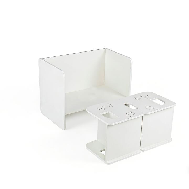 The 3-piece kids table and chair set is the perfect blend of functionality and fun for toddlers. Featuring a wooden construction with rounded edges, the children furniture set ensures a safe and comfortable area for your little ones to play, learn, and create. The built-in chalkboard adds an interactive element, encouraging creativity and imaginative play. Compact and space-saving, our kids table and chairs set is suitable for bedrooms, playrooms, or classrooms. Additionally, the kids table set can be used as storage shelves that provide ample space to keep toys, books, and art supplies organized, promoting tidy habits from an early age. Its charming patterns and clean finish fit well with any room decoration, making it a delightful and practical addition to your child’s space. Bullet Point: All in One Construction: The table can be used as a toddler desk or bench, while each chair serves well as a book rack or storage shelf, meeting kid’s different needs. The kids furniture set is perfect for various activities, such as eating, studying, reading, and crafting. Safe & Child-friendly Design: Smooth rounded corners protect your child's delicate skin, preventing accidental injuries. The kid-friendly size makes it ideal for 3+ years old boys and girls. Plus, the kids table comes with a chalkboard for creative drawing, which is great for kid’s imagination and creativity. Adorable patterns appeal to your child. Enduring & Sturdy Structure: Made from premium MDF panels, the toddler table and chairs are strong enough to stay stable and ensure long-term use. The tabletop bears a weight of 30 kg, while each chair holds up to 50 kg. Additionally, the anti-slip foot pads enhance overall steadiness and avoid scratching the floor. Space-saving Kids Desk & Chairs: When not in use, you can store 2 chairs inside the table in different ways, which maximizes space utilization. The children's table and chair set will be an ideal choice for small spaces. Easy to Transport & Maintain: Portable handles and light weight help you conveniently move the chairs from kid’s bedroom to living room. Moreover, the smooth surface can be easily wiped clean with a cloth. Features: Includes 1 table and 2 chairs for 2 kids to use Multifunctional furniture that can be used as a table, chair, stool, desk, side table or shelf Designed with a chalkboard for drawing Ergonomic backrests and smooth seats for cozy sitting 2 chairs can be stored under the desktop to save space Rounded corners and edges for safe use High-quality wooden panels for long-lasting use Great for kid’s room, kindergarten, daycare, and more Smooth surface for easy cleaning Easy to assemble with a clear user guide Specifications: Color: White Material: MDF Product Size of Table: 62.5 cm x 48 cm x 40 cm (L x W x H) Product Size of Each Chair: 30 cm x 29.5 cm x 30 cm (L x W x H) Tabletop Height: 37 cm Suitable Age: 3+ Years Old Weight Capacity of Tabletop: 30 kg Weight Capacity of Each Chair: 50 kg Net Weight: 13.5 kg Gross Weight: 15 kg Package Includes: 1 x Kids Table 2 x Chairs 1 x User Guide