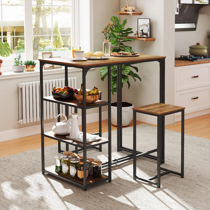 This bar-height dining set is the perfect solution! With a wide tabletop measuring 110 x 60 cm, it offers ample space for dining and entertaining, while the side 3-tier storage shelves provide convenient organization for foods, dishes, seasonings, and decorations. Whether you're hosting family gatherings, dinner parties with friends, or enjoying romantic meals, this versatile set enhances any space. Besides, the 2 bar stools to be tucked under the table when not in use, making it ideal for small apartments or rooms. Built with robust metal frames and reinforced H-shaped crossbars, the set offers reliable support and stability, with anti-slip footpads to protect your floors. Hence, this 3-piece dining table set is perfect for dining room, kitchen, living room or restaurant. Bullet Point: Large Storage Space: The bar-height rectangular table features a wide tabletop, measuring 110 x 60 cm, providing ample space for dining and entertaining. Additionally, the table comes with side 3-tier storage shelves, perfect for organizing and storing items such as foods, dishes, seasonings, and decorations.Suitable for Various Scenarios: This versatile dining set is ideal for family gatherings, dinner parties with friends and romantic meals. Whether placed in the dining room, kitchen, living room, or even a restaurant, this set will enhance any space with its stylish and functional appeal.Space-saving Design: The 2 bar stools can be easily tucked under the table when not in use, making it perfect for small apartments or rooms. Whether you're enjoying a meal or need to clear the space for other activities, this set adapts seamlessly to your needs, ensuring your living area remains clutter-free and functional.Sturdy & Stable Frame: Built with robust metal frames and reinforced H-shaped crossbars, the table and bar stools offer reliable support during use. Additionally, the anti-slip footpads protect your floors from scratches and ensure the set remains stable and secure.Easy Assembly & Maintenance: The industrial kitchen table features a smooth, easy-to-clean MDF tabletop, making maintenance a breeze. With its simple structure and clear illustrations in the user's manual, assembly is quick and hassle-free. Specification: Color: Coffee+BlackMaterial: MDF, MetalTable Size: 110 x 60 x 110 cm (L x W x H)Stool Size: 38 x 30 x 67 cm (L x W x H)Each Shelf Size: 59 x 32 cm (L x W)Weight Capacity of the Table: 100 kgWeight Capacity of Each Stool: 150 kgNet Weight: 26 kgBox QTY: 1(May vary by batch)Is Assembly Required: Yes Package Includes: 1 x Table2 x Stools1 x User’s Manual