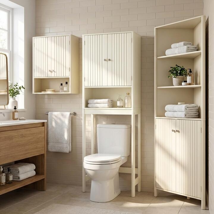 ☆ This Bundle Includes 3 bathroom cabinets: over the toilet storage cabinet, tall corner cabinet, and wall cabinet. Bullet Points: ● Optimal Corner Fit: Our tall corner cabinet features a precise 90° angle design that fits perfectly into a corner, efficiently saving space in any room. Its 3 open shelves are ideal for decorative items or frequently used essentials, while the bottom 2-door cabinet keeps your belongings neatly hidden and organized. ● Large Storage & Easy Access: Equipped with 2 doors and a large open shelf, this wall cabinet provides ample storage space for your towels, shampoos, skincare products, aromatherapy, etc. The lower open shelf keeps your essentials within easy reach. ● Maximize Your Space: This over the toilet storage cabinet is designed to maximize vertical space and keep your essentials neatly arranged. It is ideal for bathrooms or laundry rooms with limited floor space. Moreover, this over toilet bathroom space saver comes with a 3-position adjustable bottom bar that fits installation heights of various toilet pipes. Features: ● Space-saving corner design fits perfectly into small spaces ● Waveform fluted door design adds a sophisticated modern touch ● Enclosed 2-door storage cabinet keeps belongings neatly organized ● Magnetic catch ensures a secure close ● Delicate knobs and magnetic door catch ensure easy access ● 3-position adjustable shelf for items of different sizes ● 3-position adjustable bottom bar for a perfect fit over any toilet ● Assembly needed Specifications: Tall Corner Cabinet Color: Beige Material: MDF Overall Dimensions: 32 x 58 x 172.5 cm (D x W x H) Weight Capacity of Each Shelf: 10 kg Total Weight Capacity: 50 kg Net Weight: 20.5 kg Wall Cabinet Color: Beige Material: MDF Product Dimensions: 55 x 19.5 x 61 cm (L x W x H) Open Shelf Dimensions: 52 x 18 x 17 cm (L x W x H) Interior Shelf Height: 18.5 cm/21 cm Clearance of Adjustable Shelf: 3.2 cm Weight Capacity of Top Board: 15 kg Weight Capacity of Each Shelf: 10 kg Net Weight: 8.5 kg Above Toilet Organizer Color: Off White Material: MDF Product Dimensions: 60 cm x 23 cm x 168 cm (L x W x H) Space for Toilet: 54 cm x 84 cm (L x H) Clearance of Adjustable Shelf: 6.4 cm Bottom Bar Height: 17.5/20.5/23.5 cm Weight Capacity of Each Layer: 15 kg Net Weight: 15 kg Is Assembly Required: Yes Total Box Qty: 3 Packages Include: 3 x Cabinet 3 x Instruction Manual