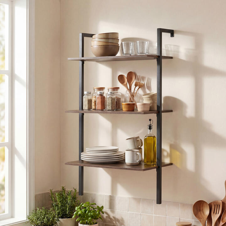 The square-tube metal frame and reinforced brackets increase stability. Moreover, the 3-tier open layout keeps items visible while making tight spaces feel less crowded. It works well as a floating kitchen rack for jars and cookbooks and it also functions as a wall mounted bathroom organizer for towels and toiletries. Furthermore, the ladder-style wall mount preserves valuable floor space for flexible room layouts. Bullet Point: Reinforced Metal Stability: This wall mounted shelving unit features a square metal tube frame that improves surface contact. Plus, the reinforced brackets are positioned under each shelf, providing reliable support for display use. Open 3-Tier Access: The ladder shelf design uses 3 open tiers for a clear view and easy reach, while helping the room feel less crowded. The 28.5 cm spacing between shelves accommodates toiletries, frames and frequently used essentials. Compact Wall-Mount Profile: Measuring 53.5 x 29.5 x 96 cm and with wall-mounted assembly, the floating shelves maximize vertical storage. Valuable floor space stays open, making it ideal for apartments or compact rooms with limited layout options. Industrial Warmth Finish: Blending rustic brown wooden boards with black metal tubes, the hanging bookshelf adds an industrial-chic accent that blends your living space seamlessly. Room-to-Room Versatility: This indoor furniture serves as bathroom organization, living room showcasing, kitchen storage or office shelving, effectively meeting your various storage needs. Specification Color: Rustic Brown and BlackMaterial: Metal, Engineered WoodOverall Dimensions: 53.5 x 29.5 x 96 cm (L x W x H)Net Weight: 4.5 kgWeight Capacity of Each Shelf: 10 kgIs Assembly Required: Yes PackageIncludes: 1 x 3-Tier Wall-Mounted Shelf1 x Instruction Box QTY 1(May vary by batch)