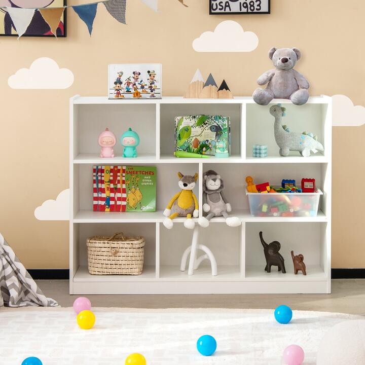 This 3-tier bookcase is composed of 8 cubes of 2 sizes that are spacious for storing your belongings, such as books, clothes, ornaments, kid's toys, etc. Great choice to create a clean and tidy environment for working, writing, or reading! This 3-tier floor standing display cabinet is made of premium board frame, anti-scratch, and deform-resistant, and very easy to clean. Designed with non-slip adhesive pads and Fixed plastic buckles on the back, the storage cabinet can withstand large capacity for stability and enhance the additional steadiness. The freestanding, upright and open design also provides great convenience for easy fetching and looking up. The storage cube wooden bookcase can be widely used as a bookcase, toy cabinet, and display cabinet to meet your different needs. You can put it in the living room, bedroom, study, office, kids' room, and reading room. Simple and stylish appearance adds some character to your home style! Bullet Points: 8-Section Large Storage Space: With 2 large and 6 small open compartments, this children's bookcase easily stores kids' items such as cartoon books, toys, snacks, clothes and school supplies, keeping kids' room neat and organized to reduce visual clutter. And wide cabinet top with raised edges is available to display some trinkets. Proper Height and Safe Design: The height of the cabinet top above the ground is 93 cm, perfect for kids to reach for their favourite toys without assistance. For kids' safety, smooth and rounded edges without burrs prevent kids from scratches. And raised the bottom of 8 cn offers a stable base while protecting items on the lower shelf from getting dirt. Multipurpose Storage Cabinet: Featuring a simple style and ample storage capacity, the versatile storage cabinet can not only be used as a kids' bookcase or toy storage organizer in a kid's room, study or bedroom but also works great as a normal display cabinet in an entryway or living room, which is all up to your kid. Durable Frame and Stable Base: Selected from thickened E0 grade engineered board, this wooden storage cabinet ensures excellent durability and high load capacity. The sturdy top holds up to 60 kg, and each cube holds up to 20 kg. Additionally, the reinforced hardware and non-slip pads enhance the overall stability. Effortless Assembly and Cleaning: The children's bookcase comes with detailed illustrated instructions, so that you can install it step by step effortlessly. What's more, the board surface is waterproof and easy to clean. Any dirt or stains can be wiped off with a damp cloth, facilitating your daily maintenance. Feature: 8 cubes compartments of 2 sizes for spacious storage space Full open shelves with proper height for easy fetching Wide top with elevated edges provides extra storage space Sturdy wooden bookcase with reinforced back buckles for stability Smooth surface and round corners prevent accident injuries Reinforced Structure to support a large weight capacity Perfect for playrooms, living rooms, school classrooms, kindergartens Easy to clean and maintain with a waterproof and smooth surface Simple and stylish appearance can better match your home decoration Specification: Colour: Grey/White Material: Engineered wood, MDF Overall dimension: 122 cm x 32 cm x 93 cm (L x W x H) Dimension of large cube: 58.5 cm x 30 cm x 26.5 cm (L x W x H) Dimension of small cube: 38.5 cm x 30 cm x 26.5 cm (L x W x H) Net weight: 33 kg Weight capacity of top: 60 kg Weight capacity of each cube: 20 kg Package includes: 1 x Bookcase 1 x User's Manual Box Qty:1(May vary by batch)