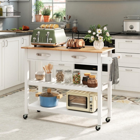 The spacious wooden countertop provides ample room for prep or serving, while the 2 drawers and 2 shelves offer extensive storage for kitchen essentials, keeping everything organized and accessible. Crafted with a rubber wood top and pine wood frame, this kitchen rolling cart ensures durability and stability. The mobile design with 4 universal wheels, including 2 lockable ones, allows easy transportation between kitchen and dining areas. BulletPoint: Spacious Countertop: This kitchen island features a generous 106 cm x 43 cm wooden countertop that provides ample space for preparation or serving. The easy-to-clean surface enhances your space's functionality. Ample Storage Space: Equipped with 2 drawers and 2 open shelves, this rolling cart offers extensive storage possibilities. It's perfect for organizing kitchen essentials like utensils, pots, pans, appliances, and more, keeping everything within easy reach. Solid Wood Construction: Crafted with a rubber wood countertop and sturdy pine wood frame, this wooden kitchen island is built to last. Its robust structure ensures stability and durability, making it a practical addition to any kitchen setup. Mobile & Versatile Addition: Equipped with 4 universal wheels, 2 of which are lockable with brakes, this serving trolley is effortless to move between your kitchen and dining room or locked in place. Convenient Side Handle: Designed with a side handle, this rolling kitchen island not only offers an additional way to maneuver the unit but also serves as a convenient towel or utensil holder. Specification: Colour: Natural + White Material: Rubber Wood + Pine Wood Overall Dimension: 116 cm x 43 cm x 89 cm (L x W x H) Countertop Dimension: 106 cm x 43 cm x 89 cm (L x W x H) Shelf Dimension: 96.5 cm x 36 cm x 26 cm (L x W x H) Interior Dimension of Each Drawer: 42.5 cm x 26.5 cm x 8 cm (L x W x H) Weight Capacity of Countertop: 50 kg Weight Capacity of Each Shelf: 20 kg Weight Capacity of Each Drawer: 8 kg Net Weight: 23 kg Is Assembly Required: Yes PackageIncludes: 1 x Kitchen Island 1 x Instruction Manual Box Qty: 1(May vary by batch)