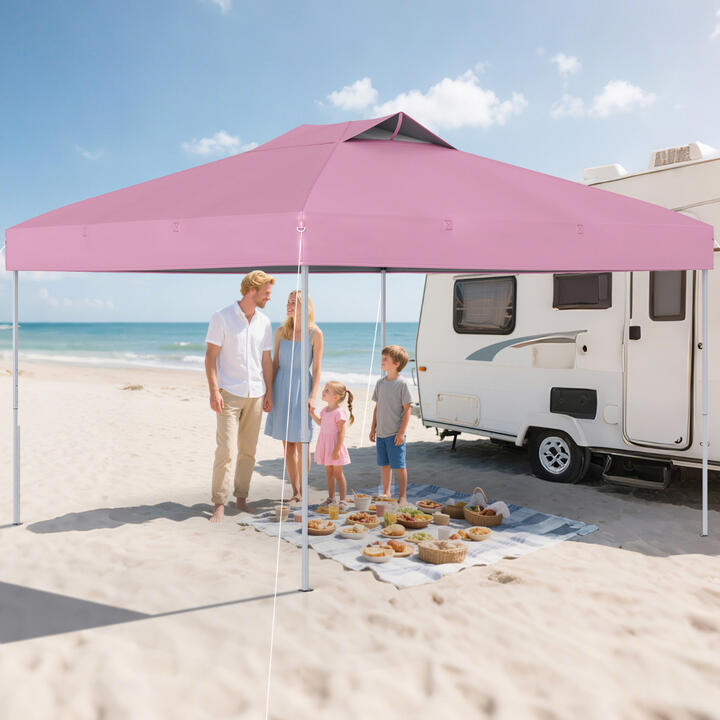 This pop up canopy tent measures 295 x 295 x 255-275 cm (L x W x H), complete with a 3-level adjustable height, perfect for various outdoor activities such as commercial events, camping, festivals, tailgating, and backyard gatherings. It features an innovative one-push locking mechanism, which allows for quick and easy setup and takedown, seamlessly operated with one hand and in seconds. When not in use, you can easily collapse it and store it in the portable carrying bag, making storage a breeze. For enhanced stability and security, the canopy is equipped with 8 metal stakes and 4 wind ropes, complete with an air vent on the top to reduce wind pressure, ensuring a secure and sheltered outdoor space. More than that, the canopy is crafted of premium oxford fabric with silver coating, offering superior sun and rain protection, built to last (Note: Please avoid using it in heavy rain or strong windy days). This canopy tent is your go-to solution for all your outdoor shelter requirements. Bullet Point: One-Push Locking Mechanism: This pop up canopy tent is equipped with a one-hand center lock system, making it easy and effortless to secure or release the trusses without the hassle of locking and unlocking the canopy leg sliders. It ensures a swift setup and takedown in mere seconds, requiring no tools. Premium Oxford Canopy: Crafted from a reliable oxford canopy with silver coating, the camping tent provides UPF50+ sun protection and resistance against fading, tearing, and light rain. It is designed as a temporary shelter and please avoid using it in heavy rain or strong windy days. Stable and Reliable Construction: The outdoor gazebo comes with a top air vent for promoting ventilation and reducing wind pressure, so as to enhance stability. Moreover, it includes 4 wind ropes and 8 ground stakes to firmly anchor each corner of the tent, ensuring safety in breezy conditions. Portable and Versatile Design: The canopy includes a portable carrying bag making it easy to store and transport. It is an ideal shading solution for various outdoor activities, such as beach parties, backyard BBQs, camping, park picnics, flea markets, sports events, and more. Large Shading Area: Offering a spacious coverage area of 295 x 295 x 255-275 cm (L x W x H), this instant setup outdoor gazebo ensures ample shade for your gatherings. Additionally, it features 3 adjustable height settings (255/265/275 cm) to meet your needs and enjoy enhanced comfort under a generous shade span. Specifications: Colour: Pink Material: Oxford Fabric, Silver Coating, Metal Product Dimensions: 295 x 295 x 255-275 cm (L x W x H) 3 Adjustable Heights: 255/265/275 cm Ground Clearance: 155/165/175 cm Carrying Bag Size: 117 x 20 x 20 cm (L x W x H) Net Weight: 14.5 kg