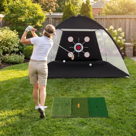 Measuring a spacious 314 x 179 x 199 cm (L x W x H), this golf net comes complete with a tri-turf mat, multiple target zones, 5 practice balls, and a tee to suit your training needs. Whether working on powerful drives or refining your short game, this net's selected oxford fabric backed by reinforced fiberglass poles provides steadfast durability and reliable shot containment. Moreover, effortless to set up and fold down, it's equally suited for indoor garages or outdoor backyards. Improve your swing, precision, and confidence with a practice tool designed to support your journey from beginner to pro. Perfect as a thoughtful choice, this golf training net enhances your golf experience with every session. Bullet Points: All-in-One Golf Training Solution: This 314 x 179 x 199 cm (L x W x H) golf practice net set includes a large impact target fabric with 4 mesh pockets, a foldable tri-turf mat, 5 balls and a tee. From powerful drives to short-game chips, it supports all your training needs for golfers of various levels. Reliable & Stable Structure: Built from high-strength oxford fabric and polyester net, this golf hitting aid is engineered to absorb repeated and high-speed impacts without tearing. With reinforced fiberglass poles and 4 ground stakes, it also keeps your shots safely contained, ensuring durability and long-term reliability. Multiple Target Accuracy Training: With a central bullseye and additional target zones, this golf training net helps golfers improve aim, distance control, and shot precision. Plus, the tri-turf mat features premium rough turf, green turf, and fairway turf, enabling you to practice a range of realistic short-game lies from a single station. Ideal Choice for Golf Enthusiasts: This golf net makes practice sessions more engaging and skill-focused, fitting for both indoor and outdoor spaces like the garage, lawn, or backyard. Moreover, it's a thoughtful gift for friends, dads, husbands, and anyone who enjoys golf training at home. Quick Setup & Portable Design: With a clear instruction, this golf hitting net ensures hassle-free assembly. After practice, it folds down compactly into the carrying bag for easy transport and convenient storage, making it suitable for golf training at a friend's house or on the go, offering golf fun wherever you are. Specifications: Color: Black Material: Fabric, Fiberglass, Metal, EVA, PPT Overall Dimension: 314 x 179 x 199 cm (L x W x H) Size of Tri-Turf Hitting Mat: 61 x 31 cm (L x W) Net Weight: 4 kg Is Assembly Required: Yes Box Qty: 1 Package Includes: 1 x Golf Net, 1 x Tri-Turf Hitting Mat 1 x Tee, 5 x Balls 4 x Ground Stakes 1 x Carrying Bag 1 x Instruction