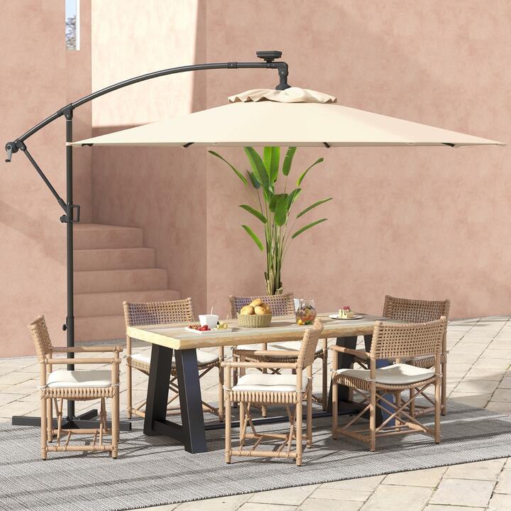 Featuring 32 light beads, this LED-lighted umbrella enhances your outdoor ambiance. The cantilever umbrella features tilt adjustment, allowing you to align it with the sun's movements for optimal shading and comfort. The 360-degree rotatable joint allows you to adjust the canopy and rotate it 360°. Additionally, the polyester fabric canopy provides better sun protection. The hanging umbrella's sturdy structure, comprising 8 metal ribs, an aluminum pole, and a cross base, ensures exceptional durability and stability. Its generous size provides ample shade for lounging and dining areas, enhancing your outdoor living experience. Bullet Point:Solar Powered LED Lights: Illuminate your patio and summer nights with the solar offset hanging umbrella, featuring 32 light beads to enhance your outdoor ambiance. Experience easy lighting control via a convenient light switch, powered by an automatically charging solar panel, providing up to 6-10 hours of illumination once fully charged. Adjustable Tilt Mechanism and 360° Rotation: The outdoor hanging umbrella is equipped with a crank handle for easy operation. Easily adjust the umbrella's angle for optimal shade coverage throughout the day, enhancing your outdoor comfort. The umbrella also offers 360° rotation with effortless freedom of movement. Stable Structure with Cross Base: Featuring 8 metal ribs and supported by a sturdy and rustproof aluminum pole, the heavy-duty sun umbrella guarantees exceptional durability and stability. Its robust crossed base offers reliable support. We recommend using a weighted base (not included) to anchor the umbrella in place. Quality Canopy with Vented Top: Crafted from premium polyester fabric that is sun-protective, drizzle-proof, fade-resistant, and tear-resistant, the canopy of this hanging market umbrella ensures longevity for outdoor use. Additionally, its vented tops allow for optimal airflow, making it an ideal choice for any outdoor setting. Versatile Outdoor Use: Measuring 300 x 245 cm (Dia. x H), the lighted patio cantilever umbrella provides a spacious shading area for your outdoor activities. Designed for outdoor use, you can enjoy superior shading and comfort while lounging in your backyard, patio, garden, or poolside area. Specifications:Colour: Beige Material: Aluminum, PolyesterProduct Dimensions: 300 x 300 x 245 cm (L x W x H) Net Weight: 13 kg Package Includes:1 x Offset Umbrella with Solar Light1 x Cross Base1 x Instruction Box Qty:1(May vary by batch)