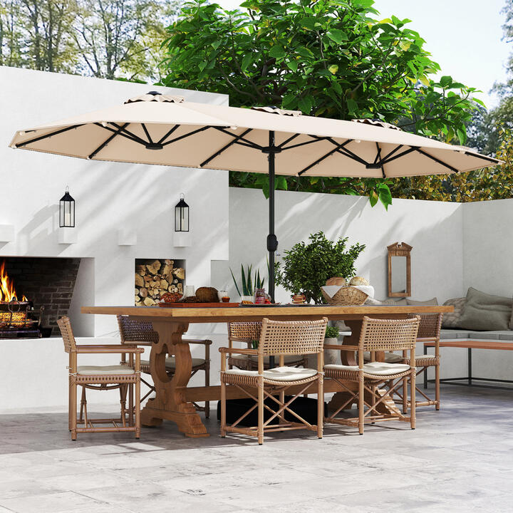 The standout features of our patio umbrella is the solar powered LED lights that charge during the day and illuminate the area at night, creating an inviting atmosphere after the sun sets. The twin size patio umbrella features 2 air vents for optimal air circulation, keeping you cool and comfortable on the hottest days. Furthermore, these air vents and the 12 umbrella ribs promise a sturdy structure. Crafted from high-quality PA-coated polyester fabric, the canopy is not only water-repellent but also sun-proof and tear-proof. The double-sided patio umbrella is equipped with a convenient crank handle that makes opening and closing a breeze. The hook and loop fasteners ensure that the umbrella stays securely in place when not in use, simplifying storage. Additionally, the oversized outdoor umbrella comes with an included base and 2 sandbags that provide extra stability. Bullet Point: Expansive Shade Coverage: With an impressive coverage area of 406 x 210 cm, the double-sided patio umbrella create the perfect setting for relaxation. Crafted from PA coated polyester fabric, the canopy of the outdoor twin umbrella resists fading and wear, while providing a shield against the sun and light rain. Solar Lights for All Day Enjoyment: With a hanging switch easily accessible, you can readily activate the illumination provided by the 36 LED lights to prolong your outdoor gatherings into the night. Powered by a solar panel, these energy-efficient lights present a sustainable lighting option. Please turn off the lights during daytime. Enhanced Sturdiness and Ventilation: Featuring 12 robust umbrella ribs and powder-coated metal frame, the extra large market umbrella boasts a sturdy structure. Moreover, the 3 air vents can promote ventilation and greatly reduce wind pressure, thus ensuring increased stability. Easy to Open and Store: Equipped with smooth hand-crank system, the rectangle outside umbrella can be opened and closed within seconds. Also, a chain pin will prevent sudden closure. Furthermore, the umbrella can be closed and fastened with a fixing strap, ensuring compact storage. Please close the umbrella when not in use. Weighted Base Included: To ensure stability and prevent the umbrella from toppling over, the outdoor twin umbrella offers a large weighted base with 2 sandbags. Each sandbag can accommodate 29 kg of soil to anchor the umbrella securely in place. The cross base stand is a breeze to install. Specifications: Color: Beige, Coffee, Grey Material:Polyester Fabric, Metal Product Dimensions: 406 x 210 x 226 cm (L x W x H) Ground Clearance: 202 cm Sand Capacity of Each Sandbag: 29 kg Net Weight: 14.5 kg Box Qty: 1(May vary by batch) Package includes: 1 x Double-Sided Patio Umbrella 1 x Use’s Manual