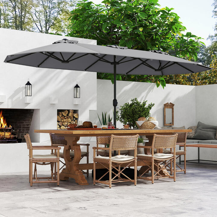 The standout features of our patio umbrella is the solar powered LED lights that charge during the day and illuminate the area at night, creating an inviting atmosphere after the sun sets. The twin size patio umbrella features 2 air vents for optimal air circulation, keeping you cool and comfortable on the hottest days. Furthermore, these air vents and the 12 umbrella ribs promise a sturdy structure. Crafted from high-quality PA-coated polyester fabric, the canopy is not only water-repellent but also sun-proof and tear-proof. The double-sided patio umbrella is equipped with a convenient crank handle that makes opening and closing a breeze. The hook and loop fasteners ensure that the umbrella stays securely in place when not in use, simplifying storage. Additionally, the oversized outdoor umbrella comes with an included base and 2 sandbags that provide extra stability. Bullet Point: Expansive Shade Coverage: With an impressive coverage area of 406 x 210 cm, the double-sided patio umbrella create the perfect setting for relaxation. Crafted from PA coated polyester fabric, the canopy of the outdoor twin umbrella resists fading and wear, while providing a shield against the sun and light rain. Solar Lights for All Day Enjoyment: With a hanging switch easily accessible, you can readily activate the illumination provided by the 36 LED lights to prolong your outdoor gatherings into the night. Powered by a solar panel, these energy-efficient lights present a sustainable lighting option. Please turn off the lights during daytime. Enhanced Sturdiness and Ventilation: Featuring 12 robust umbrella ribs and powder-coated metal frame, the extra large market umbrella boasts a sturdy structure. Moreover, the 3 air vents can promote ventilation and greatly reduce wind pressure, thus ensuring increased stability. Easy to Open and Store: Equipped with smooth hand-crank system, the rectangle outside umbrella can be opened and closed within seconds. Also, a chain pin will prevent sudden closure. Furthermore, the umbrella can be closed and fastened with a fixing strap, ensuring compact storage. Please close the umbrella when not in use. Weighted Base Included: To ensure stability and prevent the umbrella from toppling over, the outdoor twin umbrella offers a large weighted base with 2 sandbags. Each sandbag can accommodate 29 kg of soil to anchor the umbrella securely in place. The cross base stand is a breeze to install. Specifications: Color: Beige, Coffee, Grey Material:Polyester Fabric, Metal Product Dimensions: 406 x 210 x 226 cm (L x W x H) Ground Clearance: 202 cm Sand Capacity of Each Sandbag: 29 kg Net Weight: 14.5 kg Box Qty: 1(May vary by batch) Package includes: 1 x Double-Sided Patio Umbrella 1 x Use’s Manual
