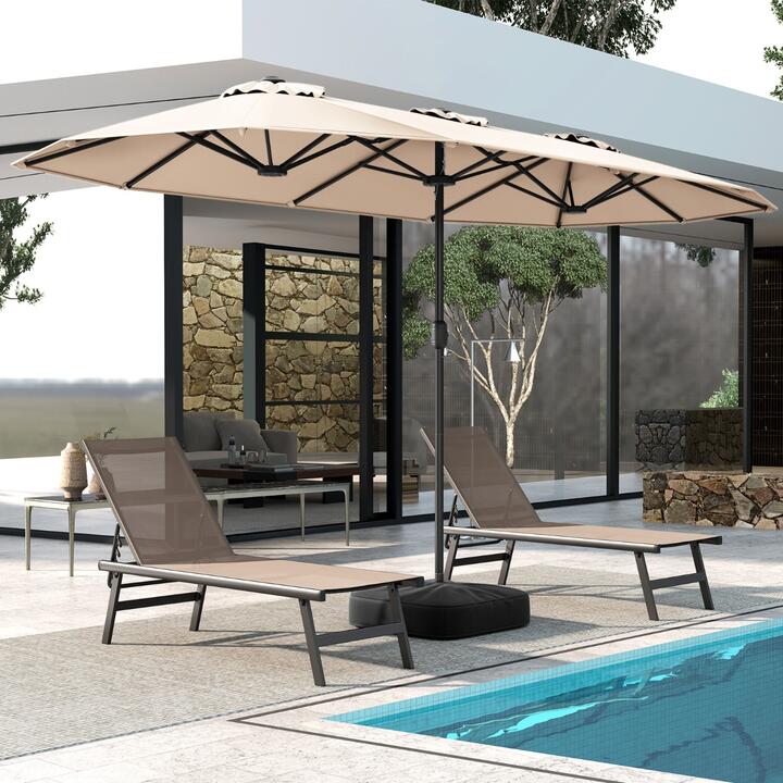 Creating a cool leisure zone with the patio cantilever umbrella! With impressive dimensions of 396 cm x 201 cm, the double-sided patio umbrella provides an enlarged shading space to accommodate your patio furniture, making it perfect for party, commercial events and family gatherings. And the air vents will ensure a cool experience. Made of PA coated yarn-dyed fabric, the canopy is not easy to fade. Meanwhile, the durable & UV-protective material will shield you from harmful rays and light rains. The stable heavy-duty frame ensure maximum stability even in windy conditions. Furthermore, there are 12 umbrella ribs to add wind-resistance. For added stability, we provide an included fillable weighted stand. And the large rectangular patio umbrella is quipped with a safety lock mechanism that prevents accidental folding. With easy-to-operate crank handle, the large patio umbrella ensures hassle-free opening and closing, while the fixing strap making storage a breeze. Bullet Point: Large Space and Vented Top: Boasting 396 cm x 201 cm large shading space, the double-sided market umbrella will meet your needs to hold a party or commercial event. Thanks to the air vent, the outdoor table umbrella promotes efficient air circulation, ensuring a pleasant breeze flows beneath the canopy. Non-fading and Weatherproof Canopy: Crafted from yarn-dyed fabric, the patio umbrella canopy features high color-fastness, ensuring lasting use. Moreover, the selected fabric is PA coated to offer excellent protection against sunlight and light rain. Note: Please do not use in adverse conditions. Strong and Windproof Frame: Constructed of powder-coated heavy duty frame, the umbrella features unwavering stability and durability. Additionally, the large double-sided patio umbrella boasts 12 sturdy ribs that provide optimal wind-proof performance. Easy Operation and Folding: Equipped with an easy-to-maneuver crank handle, the twin table umbrella can be fully opened with ease. And there is a safety lock to keep the outdoor market umbrella securely opened. With a fixing strap, the large patio umbrella can be easily folded and stored when not in use. Extra Weighted Fillable Base: To further stabilize the extra large patio umbrella, there is a cross base, which can be filled with 30 kg sand to increase weight. You can install the stand frame, fill the 2 sandbags and attach the cover in short time to obtain a umbrella base. Features: Double-sided design enlarges shade area to accommodate more people PA coated yarn-dyed fabric is non-fading, sun-proof and drizzle-resistant Vented top facilitates air circulation and improves stability Sprayed metal umbrella pole ensures higher stability Double stitched rib pockets keep the 12 strong metal ribs in place Equipped with safety lock to prevent accidental folding Quick to open and close the umbrella with easy-to-operate crank handle Included fillable weighted stand adds stability Fixing strap for easy storage and folding Applicable to pool, deck, patio, garden, yard Specifications: Color: Beige, Grey Material: Metal, 180G Yarn Dyed Fabric, PA Coating Overall Size: 396 x 201 x 240 cm (L X W X H) Cross Base Size: 65 x 65 cm(L X W) Umbrella Ground Clearance: 207 cm Net Weight: 13.5 kg Package Includes: 1 x Double-Sided Patio Umbrella 1 x Umbrella Base 1 x User Guide Box Qty:1(May vary by batch)