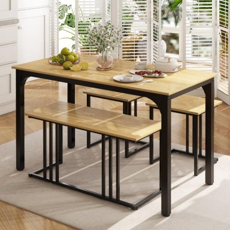 This dining table for 4 persons comes with a table, a bench, and 2 stools, providing a perfect place for enjoying casual meals with family, enjoying afternoon teas or drinking with friends. And it can be a good office desk to handle working or study tasks. Besides, it is supported by a sturdy powder-coated steel frame, which is not easy to rust, peel, or chip, ensuring long-lasting durability and a large loading capacity. And you can adjust the bottom footpads to make the table set fitting uneven floors, ensuring more stability. Other than that, the bench and 2 stools can be conveniently tucked under the table for saving floor space when not in use. With the black steel frame and exquisite wood-grain boards, this practical kitchen dining room table set can perfectly blend into any home style. And it can be a highlight to your kitchen, living room, office, tea room, restaurant, coffee shop, and more. Bullet Points:Dining Table Set for the Whole Family: The 4-piece dining table set includes a wooden table, a bench, and 2 stools, which are perfect for family gatherings or entertaining friends. And the spacious tabletop measures 120 cm x 60 cm (L x W), providing a comfy and relaxing dining environment. Sturdy and Stable Structure: The supporting frame is constructed of heavy-duty powder-coated steel pipes that are anti-rust and waterproof while ensuring great durability and sturdiness. And the table loads up to 150 kg, the bench 300 kg, and each stool 150 kg. Besides, there exist adjustable footpads on the bottom for keeping stability even on uneven floors. Space-Saving Design: The bench and 2 stools could be nested under the dining table, which would not take up much floor space when not in use, and it can be a perfect solution for small rooms, apartments, small kitchens, or studios. And you can also put stools on the table for cleaning the floor under the table conveniently. Industrial and Stylish Appearance: With beautiful wooden finishes and clear lines, the industrial kitchen dining room table set can be matched with any style of home decoration. In addition, the dining table can also be served as a computer desk, writing workstation, gaming desk, bistro table, office desk, and more. Effortless Installation and Easy Maintenance: The modern wooden table set with all necessary accessories is effortless to set up. According to the detailed instructions, you can easily assemble the table set. Moreover, the tabletop is made of premium veneered MDF board, allowing for easy cleaning with a damp cloth. Specifications:Colour: Brown, Oak Gray, NaturalMaterial: MDF, SteelSize of the Table: 120 x 60 x 75 cm (L x W x H)Size of the Bench: 86 x 35 x 45 cm (L x W x H)Size of Each Stool: 40 x 35 x 45 cm (L x W x H)Weight Capacity of the Table: 150 kgWeight Capacity of the Bench: 300 kgWeight Capacity of Each Stool: 150 kgNet Weight: 27 kg Package Includes:1 x Table1 x Bench2 x Stool1 x User's Manual Box Qty:1(May vary by batch)