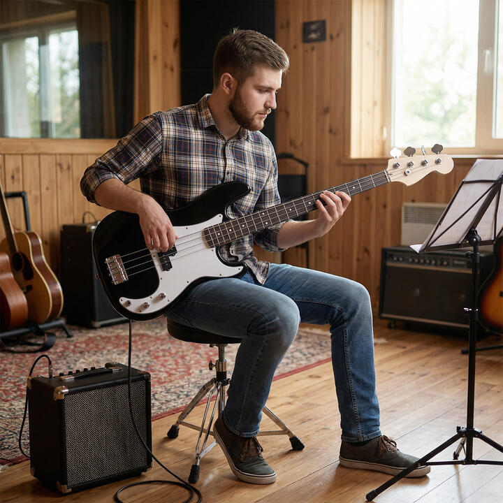 Featuring 4 steel strings and smooth finish, the bass offers a comfortable and enjoyable playing experience. The dual pickup system ensures a versatile range of tones, allowing players to explore different sounds and styles effortlessly. Open-gear tuners bring precise tuning stability, making practice and performance more productive. Additionally, the complete bass guitar set comes with all essential accessories, including a gig bag, guitar cable, shoulder strap, rope, and 3 picks. Whether you're just picking up the bass or upgrading to a full-size instrument, our right-handed bass guitar kit will be a perfect choice. You can use it to join in office leisure activities, school performances, or band shows. Bullet Point: Excellent Performance: The 45.5 inch electric bass guitar provides rich and deep tones through double pickups, ensuring great sound quality for various music styles. Plus, 4 steel strings allow for better playing experience for both practice and performance.Easy to Adjust Sound: There are 2 knobs for tone adjustment and volume adjustment, allowing you to customize the sound. Moreover, chrome-plated tuning pegs are designed with a 21:1 gear ratio to improve tuning accuracy.Exquisite Craftsmanship: The bass guitar features a maple wood neck, a technical wood fingerboard, and a poplar body for outstanding stability and long-lasting reliability. It will accompany you for years to come.Complete Kit for Easy Use: The bass guitar kit includes everything you need to get started, such as a cable, a rope, a shoulder strap, a truss rod, a wrench, and 3 picks. Note: The color of the picks may vary. It also comes with a gig bag for easy carrying.Ideal Beginner Bass Guitar: Perfect for both beginners and professional bassists, the right-handed electric bass guitar offers smooth playability and a balanced feel. Ergonomic design and smooth painted surface enable beginners to comfortably play the bass guitar. It is suitable for music teaching, band show, or school performance. Specification: Color: Blue + White/ Black + WhiteMaterial: Metal, Maple Wood, Technical Wood, PoplarProduct Dimensions of Bass Guitar: 117 x 32.5 x 5.5 cm (L x W x H)Size of Gig Bag: 122 x 40 cm(L x W)Net Weight: 4.5 kgBox QTY: 1(May vary by batch)Is Assembly Required: Yes Package Includes: 1 x Bass Guitar1 x Gig Bag1 x Cable1 x Shoulder Strap1 x Rope1 x Truss Rod1 x Wrench3 x Picks
