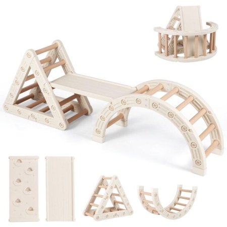 This 5-in-1 multi-functional play set includes a triangle climber, an arch a and double-sided ladder, offering a multitude of play options that can be combined or enjoyed separately. The double-sided ladder features 2 adjustable heights and rounded grips for different needs. Additionally, safety is paramount with this kids playground set, featuring rounded corners and smooth surface for a secure environment. Meanwhile, the firm connection and anti-slip foot pads allow for reliable stability. This set is also developmental, promoting motor skills, balance and hand-eye coordination in line with Montessori principles. Plus, it is a breeze to assemble and space-efficient, making it a perfect gift for birthdays or holidays. Bullet Point:5-In-1 Multi-Functional Play Set: This triangle set includes a triangle climber, an arch and a double-sided ladder, offering 5 different play options. Use them together or separately for a variety of activities, including a triangle set, climbing ramp, climbing triangle, climbing arch and a rocking arch.Adjustable Double-sided Ladder: The ladder of this kids playground features a double-sided design with climbing grips on the front side and a smoother surface on the reverse side. When attached to the triangle climber, it offers 2 different height levels, allowing you to adjust according to your child's needs and abilities.Safe Playing Environment: Designed with kids' safety in mind, this climbing toy is crafted with rounded corners and smooth surface. Meanwhile, the firm connection and 40 mm thick sticks provide overall sturdiness. There are also anti-slip foot pads to ensure the structure remains stable on the floor.Skill Development in Joy: Aligned with Montessori principles, this climbing playset aids in the development of motor skills, balance, hand-eye coordination and muscle strength. It encourages active play and helps children grow and learn through engaging physical activities, making it an educational tool as well as a toy.Perfect Present for Kids: Boasting easy assembly, this triangle set can also be rearranged when not in use to fit neatly into your home for space saving. It's an ideal birthday or holiday gift for young children, offering hours of entertainment and a valuable tool for their development. Specification:Color: Beige + CoffeeMaterial: HDPEProduct Dimensions of Triangle Climber: 78 x 42 x 69 cm (L x W x H)Product Dimensions of Semicircular Climber: 102 x 42 x 52 cm (L x W x H)Product Dimensions of Ladder: 74 x 33 cm (L x W)Total Net Weight: 9 kgWeight Capacity: 30 kgRecommended Age: 3-6 Years OldBox QTY: 1(May vary by batch)Is Assembly Required: Yes Package includes:1 x Triangle Climber1 x Semicircular Climber1 x Double-sided Ladder1 x Instruction
