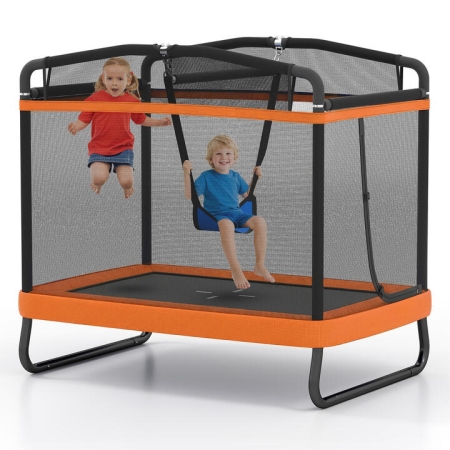 Designed for safety and stability, this toddler trampoline includes features like a no-gap design, sturdy and rustproof galvanized steel frame, and high-tensile springs. The recreational trampoline offers enhanced safety with an enclosure net, padded spring cover, and easy access entrance. Suitable for indoor and outdoor use, this versatile trampoline is a great way for children to stay active and have fun in any weather. Bullet Point: One Trampoline, Triple Fun: This small trampoline for kids includes a swing and a horizontal bar for varied play. This versatile setup offers endless fun and is perfect for encouraging active play in children, fostering physical exercise and body coordination. Note: The horizontal bar and swing are detachable. Safety Comes First: Built with a safe no-gap design, this toddler trampoline integrates the mat and spring cover seamlessly, virtually eliminating the risk of little feet or hands getting caught. Built for Stability and Longevity: This rectangle trampoline features a hot-dip galvanized steel frame with spray-painted legs to resist rust and wear. For excellent bouncing performance, 32 pcs high-tensile springs have passed 100,000 times bounce test, and a high-elastic jumping mat have passed 5000-hour sun protection test. Enhanced Safety Features: This mini trampoline comes with comprehensive safety features, including a tear-resistant enclosure net, anti-collision foam sleeves, and thick padded spring cover. The spacious L-shaped entrance makes access effortless, while the double-sided zipper and safety buckles maximize safety during play. Perfect for Indoor and Outdoor Play: This small trampoline is suitable for various scenarios, such as you living room, playroom or backyard. This is a great gift for active children, providing a fun and secure way to expel energy regardless of the weather. Specifications: Color: Blue/Pink Material: Galvanized Steel + PE + PP + PVC + EPE Overall Dimension: 177 cm x 122 cm x 170 cm (L x W x H) Jumping Mat Dimension: 143 cm x 84 cm Wall Thickness of Steel Poles: 1.5 mm Static Weight Weight of Trampoline: 300 kg Dynamic Weight Capacity of Trampoline: 60 kg Weight Capacity of Swing: 45 kg Weight Capacity of Horizontal Bar: 45 kg Suitable Age: 3+ Years Old Net Weight:26.5 kg Box Qty:1(May vary by batch) Package Includes: 1 x Kids Trampoline 1 x Instruction Manual Is Assembly Required: Yes