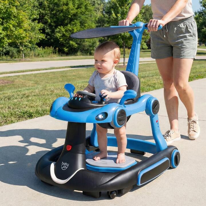From a sun-protected trolley to a joyful rocking horse, a fun bouncer, a cool walk-behind push car, to a handy feeding chair – every feature is designed to grow with your baby from 7-18 months. Safety is our priority, featuring anti-rollover design, pinch-free gaps, and speed control for peace of mind! And there's more – engage your baby with a fun-filled activity center sparkling with lights and music that ignites curiosity! Plus, enjoy hassle-free cleaning with a removable cushion and easy assembly for life on-the-go. Grab this must-have helper and make each day a delightful learning journey for your little explorer! Versatile 6-In-1 Baby Walker: This baby walker can effortlessly transforms into a trolley with a canopy for outings, a fun rocking horse, a bouncer, a walk-behind push car, and even a practical feeding chair. Perfect for babies aged 7-18 months, this innovative design supports every stage of your child's early growth and exploration, making every day an adventure. Safety Comes First: Experience worry-free parenting with safety at the forefront, as this ASTM/CPSIA compliant baby walker with wheels boasts 5 anti-slip pads, and an enlarged, ultra-stable base that prevents tipping. A 2.5"-3" front gap keeps delicate fingers safe from pinching, letting your baby confidently explore their environment. Adjustable Height & Speed for Growing Babies: Ensure lasting comfort with 3 height settings that perfectly adjust to your baby's changing needs as they grow. The push walker with speed control wheels provides tailored movement, letting parents easily adapt the walker's performance to suit beginner or more active little ones. Interactive Play Platform for Added Fun: Keep your baby entertained with a detachable activity center, featuring a steering wheel, a realistic gear shifter, engaging roller toy, and music and light buttons that spark curiosity and imagination. Designed for hands-on play and early learning, this activity center offers endless fun and requires 5 AA batteries (not included) to keep the joy and excitement going. Child-friendly Design: Pamper your baby with a soft seat cushion that provides exceptional comfort during playtime or mealtime, and is removable for convenient cleaning. With a burr-free surface, rounded corners, and an easy-grip handle, every detail of the baby activity walker is carefully crafted to protect baby's tender skin, allowing carefree use every day. Specification: Color: White + Black/Red + Black/Blue + BlackMaterial: PP, ABS, Fabric, SpongeOverall Dimensions: 72 x 62 x 79-83 cm (L x W x H)Suitable Age: 7-18 MonthsWeight Capacity: 12 kgNet Weight: 5.5 kg Box QTY: 1(May vary by batch)Is Assembly Required: Yes Package Includes:1 x Baby Walker1 x User Manual