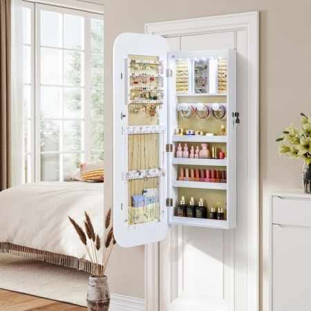This jewelry cabinet offers flexible mounting by either wall installation or over-the-door hanging, making it an ideal space-saving choice for smaller rooms. The jewelry armoire provides generous space with classification to keep all your accessories visible and organized. The built-in LED lights automatically illuminate your collection when the door opens, making it easy to select your favorite pieces. The wide full-length mirror with elegant curves enhances any room while helping you complete your look. Flexible Mounting Options: You can easily install this jewelry cabinet on the wall or hang it over a door using included door hooks with 3 height options or wall-mounting accessories, providing a customizable and space-saving storage solution for small spaces. Ample Storage Space: This jewelry armoire offers 68 earring slots, 40 stud earring holes, 2 ring slot areas, 3 bracelet rods, 24 hooks for necklaces and bracelets, and 4 storage shelves, ensuring all your jewelry is neatly displayed and always easy to find. Brighten Your Collection: This jewelry organizer is equipped with 6 bright LED lights that automatically turn on when the door opens, making it easy to view your jewelry collection and choose the perfect accessory. Note: Require 3 AAA batteries (not included). Wider Full-Length Mirror: The 42 x 108 cm mirror is built with elegant, rounded curves that not only helps you dress with confidence from head to toe but also adds a sophisticated accent to any bedroom, closet, or dressing area. Well-Made Details: Equipped with magnetic catches, a lockable door with 2 keys, and velvet lining, this jewelry cabinet offers premium security and protection. It is also designed with a special anti-tangle pocket for long necklaces. Specification: Color: White Material: MDF + Mirror + Velvet Overall Dimension: 42 cm x 10 cm x 108 cm (L x W x H) Battery Requirement: 3 x AAA Batteries (not included) Net Weight: 10 kg Box QTY: 1(May vary by batch) Is Assembly Required: Yes Package Includes: 1 x Jewelry Cabinet 2 x Door Hook 1 x Wall-Mounting Kit 1 x User Guide