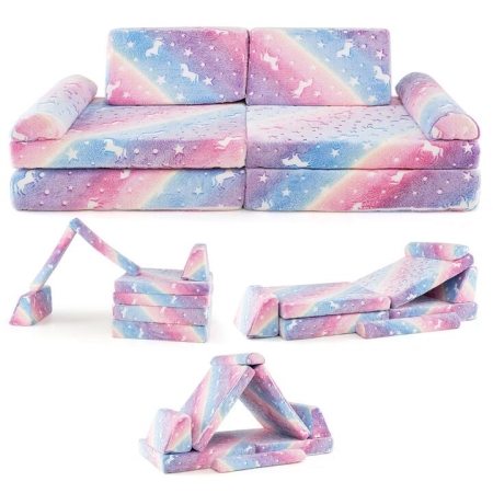 By day, your little ones can shape adventures as the 6 pcs couch transforms into forts, stages, or whatever they imagine. By night, watch them beam in delight as the sofa's glow-in-the-dark patterns light up their creations! Crafted for both active games and quiet relaxations, the play couch is all about safety and comfort with its OEKO-TEX-certified materials, plush texture, and safe hidden zippers. Easy to maintain, the removable covers are machine washable, ensuring the magic never fades. Add our charming modular play couch to your kid's play space for imaginative play and cozy evenings! Bullet Point:Glow in the Dark: The adorable patterns on our sectional sofa are designed to light up in the dark with a luminous, green glow. Simply expose the sofa to sunlight or bright indoor light for at least 10 minutes (the longer, the better), and your little ones can enjoy its magical glow that turns every evening into a delightful adventure. Ready in 2 Days: Our modular kids play couch comes vacuum sealed, and here’s how you can fully restore its shape and charm: Please remove the wrapping with care and allow 24-48 hours for the foam to rebound. You can also speed up the process and smooth out the remaining wrinkles using a garment steamer or a hairdryer. Gift for Imaginative Play: Comprising 6 separate or connected pieces with handles, the kids' play couch inspires endless possibilities for fun. Beyond using it as a 2-seater sofa or a floor mat, children can unleash their creativity and imagination by building forts, stages, tunnels, and inventive shapes such as tanks or excavators. Play with Comfort and Safety: Designed with your kids’ comfort and health in mind, our kids foam couch complies to OEKO-TEX, ASTM and CPSIA standards. Its soft, skin-friendly flannel fabric cover, supportive 25D sponge filling, and smooth, hidden zippers allow for boundless hopping, climbing and rolling without any discomfort. Warm Tips for Maintenance: The cushion covers on our toddler play couch are removable and machine-washable without shrinking or losing their delightful glowing-in-the-dark effect. To maintain their fluffiness, it is recommended to wash the covers in cold water, and tumble dry on low setting. Specifications:Colour: Grey/MulticolourMaterial: Flannel Fabric, SpongeOverall Dimension: 141 x 72 x 46 cm (L x W x H)Net Weight: 7.5 kgBox QTY: 1(May vary by batch) Package Includes:1 x Modular Kids Play Couch1 x User Guide
