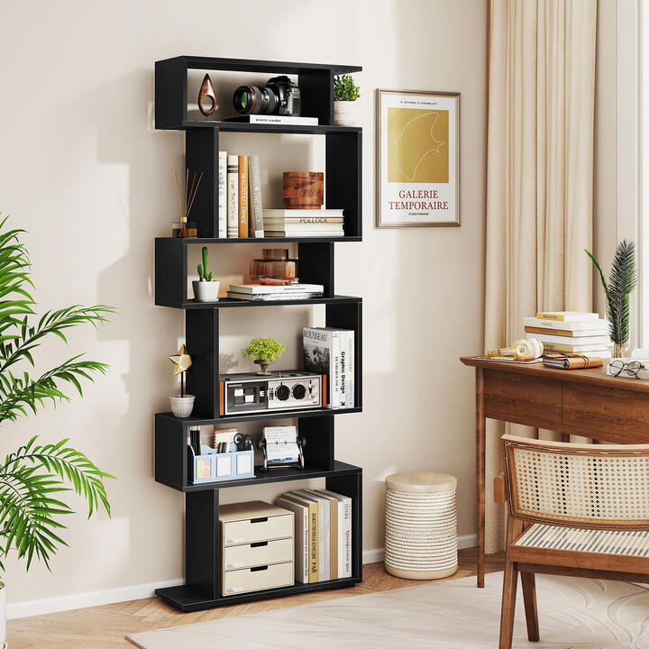 2 anti-tipping kits provide stability and safety, while a unique geometric design adds sophistication and acts as a captivating focal point in any modern interior. Versatile in use, this storage unit is ideal for displaying collectibles, organizing books, or storing essentials in any room. The bookcase also includes well-made details like a smooth surface for effortless cleaning, screw hole covers for a neat look, and protective foot pads that prevent floor scratches. Bullet Point: 6 Tier Storage Capacity: Maximize your space with the bookshelf's 6 wide shelves, perfect for organizing books, photos, souvenirs, and other essentials. This cleverly designed storage solution brings both functionality and order to your home.Safety and Stability Ensured: The bookcase boasts an enduring wooden construction capable of holding a large weight. Equipped with 2 anti-tipping kits, it ensures maximum stability and safety, making it ideal for use in family homes.Unique Geometric Design: Elevate your decorations with the display stand's striking S-shaped design. This distinctive style adds a touch of sophistication and serves as a captivating conversation piece, seamlessly fitting into any modern interior.Versatile Uses: Ideal for any room, the 60 x 20 x 163 cm (L x W x H) storage shelving unit's broad utility makes it perfect for displaying collectibles in the living room, organizing books in the study, or storing essentials in the bedroom.Well-Made Details: Attention to detail is evident in the bookshelf's design, from the smooth surface that allows for easy cleaning to the screw hole covers that maintain a sleek appearance. Additionally, protective foot pads safeguard your floors against scratches. Specifications: Colour: Rustic Brown/Black/White Material: Engineered Wood Overall Dimensions: 60 x 20 x 163 cm (L x W x H) Size of Big Compartment: 47 x 20 x 32 cm (L x W x H) Size of Small Compartment: 47 x 20 x 17 cm (L x W x H) Load Capacity of Each Shelf: 5 kg Load Capacity of Bottom: 10 kg Net Weight: 16 kg Box Qty: 1 (May vary by batch) Package Includes: 1 x 6-Tier Bookshelf 1 x Instruction Manual