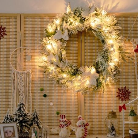 This Christmas wreath can decorate your home to add the warm and joyful festival atmosphere for you! Containing 50 LED lights, the Christmas wreath serves to provide a colorful and shiny space for you, which also brings the warmth to the winter. When the night falls, you can turn on the light, and then it will be the most eye-catching decoration. With the timer, it’s convenient to control the light. The Christmas wreath comes with several ornaments such as silver bristles and red berries. Without extra decorations, it offers different Christmas elements and makes the festival more cheerful. The Christmas wreath has 30 pine needles and 110 PVC tips, which provides a lush and full look and makes it lifelike in appearance. Using the new PVC material, the needles will not deform easily and keep the natural appearance for you. Therefore, whether it’s hung on the wall indoors or door outdoors, surely it will deliver the vitality and warmth to you. Bullet Point: Warm White LED Lights with Timer: This Christmas wreath comes with a string of 50 warm LED lights, creating a warmer atmosphere for you. And built-in timing device (battery not included) can automatically turn off after turning on the light 6 hours, which can save energy for you. Rich Ornaments & Festival Details: Beautiful silver bristles and red berries that full of festival element decorated on the wreath, which delivering the strong Christmas atmosphere, with no need to buy other decorations. Moreover, it makes your decoration finest and eye-catching. Lush & Natural Appearance: The 140 branches make the wreath lush and natural, giving a full appearance. In addition, the interior metal ring can also support these branches so as to deliver the fluffy looking. Indoor & Outdoor Display: Equipped with LED lights, the wreath will bring you a warm festival atmosphere both indoor and outdoor. The stable structure supported by the iron ring is not easily deformed outdoors. Meanwhile the wreath weighs only about 0.84kg, making it easy to handle and hang. Compact Design for Easy Storage: The spruce Christmas wreath is compact for easy storage. When you don't need it, you can store it in the cabinet, warehouse and any small space. It is lightweight and portable for your daily movement, which can be carried anywhere you want. Features: Made of 100% New environment-friendly PVC material for safe use Fluffy 140 branches to create a dense Christmas wreath Simulated red berries and pine needle with natural color and texture 50 LED lights with warm white color for better decoration Compact and lightweight design for easy storage and carrying Built-in timing device for turning the lights on for 6 hours, off for 18 hours Suitable for indoor and outdoor use Perfect for doors, windows, stores, fireplaces, and more Specifications: Color: Green Material: New PVC + metal Dimension: 60cm (diameter) Net weight: 0.84kg Number of pine needles: 30 tips Number of PVC tips: 110 tips Number of lights: 50 Battery type: 3 AA (not included) Width of needles: 75 + 15 + 15mm PVC width: 45 + 45 + 10mm Package Includes: 1 x Pre-lit Christmas Wreath 1 x Timer 1 x Instruction Note: Automatically turn off for 18 hours after 6 hours brightening. Box Qty:1(May vary by batch) Is Assembly Required: Yes