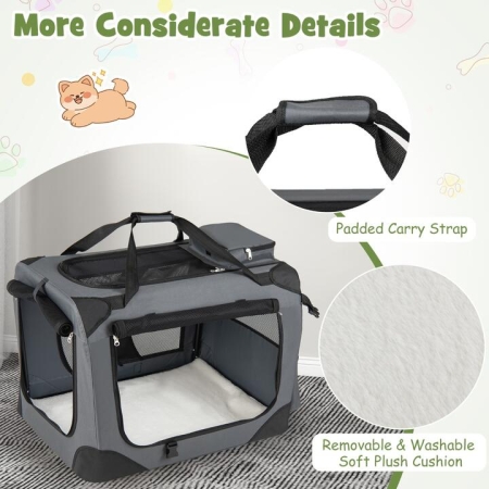 With a size of 61 cm × 43 cm × 43 cm/72 cm × 52.5 cm × 52.5 cm/84 cm × 58 cm × 58 cm/91 cm × 64 cm × 64 cm(L × W × H), the dog crate is suitable for small/medium/large dogs. The retractable spring metal frame allows the collapsible dog crate to set up and collapse quickly without any tools. A reinforced metal structure combined with 600D Oxford fabric helps the soft side dog kennel stay upright and hold its form, while strengthened corners reduce drooping when your pet shifts or leans. Also, there are more considerate details. Featuring 3-door design & 5-sided ventilation, the portable pet kennel with self-locking zippers ensure easy access and interaction while helping deter escapes. A lightweight design with padded carry strap support makes the portable pet kennel comfortable to transport. Also, 2 removable storage pockets keep treats and travel paperwork neatly together for errands, hotels, and road trips. 30 S Quick Assembly & Folding: Thanks to an innovative retractable spring metal frame, the portable dog kennel sets up and folds down in about 30 seconds with no tools. It can be folded into a slim size that can be put neatly into car trunks, RV storage, or a quiet corner at home. Sturdy & Long-lasting Structure: The collapsible dog crate is built with a sturdy metal frame and rugged 600D Oxford cloth for dependable structure. Reinforced corners help it stay stable when pets shift positions against the sides. And the suggested weight is up to 11 kg/16 kg/23 kg/32 kg. Secure & Pet-friendly Design: The soft side dog kennel uses 5-sided mesh to offer breezy ventilation and clear visibility, which can help reduce pet anxiety. 3 openings with self-locking zippers provide easy entry while helping prevent escapes. A removable and washable fleece cushion creates a comfy and clean space for your furry friends. Easy Transport & Smart Storage: The folding soft pet crate stays lightweight for easy transport, and the padded carrying strap helps reduce hand strain. 2 removable storage pockets keep supplies organized, which keeps travel calmer for both pets and owners. Choose the Right Fit: Measuring 61 cm × 43 cm × 43 cm/72 cm × 52.5 cm × 52.5 cm/84 cm × 58 cm × 58 cm/91 cm × 64 cm × 64 cm(L × W × H), the foldable dog travel crate is suitable for Small/Medium/Large dogs and cats. Please make sure the size of your pet before purchasing.(Length: From the tip of the nose to the base of the tail; Height: From the head to the floor) Specification: Color: GrayMaterial: Mesh, Metal, Oxford loth, Rabbit FurPV10551GR (S)Product Dimension: 61 cm × 43 cm × 43 cm(L × W × H)Folded Dimension: 61 cm × 43 cm × 7.5 cm(L × W × H)Mat Size: 59 cm × 41 cm(L × W)Side Door Size: 46 cm × 30 cm(L × W × H)Net Weight: 3 kgMaximum Weight: 11 kgPV10552GR (M)Product Dimension: 72 cm × 52.5 cm × 52.5 cm(L × W × H)Folded Dimension: 72 cm × 52.5 cm × 8.5 cm(L × W × H)Mat Size: 68 cm × 48.5 cm(L × W)Side Door Size: 53 cm × 33 cm(L × W × H)Net Weight: 3.5 kgMaximum Weight: 16 kgPV10553GR (L)Product Dimension: 84 cm × 58 cm × 58 cm(L × W × H)Folded Dimension: 84 cm × 58 cm × 10 cm(L × W × H)Mat Size: 83 cm × 54 cm(L × W)Side Door Size: 65 cm × 40 cm(L × W × H)Net Weight: 4 kgMaximum Weight: 23 kgPV10554GR (XL)Product Dimension: 91 cm × 64 cm × 64 cm(L × W × H)Folded Dimension: 91 cm × 64 cm × 9 cm(L × W × H)Mat Size: 88 cm × 60 cm(L × W)Side Door Size: 76 cm × 41 cm(L × W × H)Net Weight: 4.5 kgMaximum Weight: 32 kgBox QTY: 1(May vary by batch)Is Assembly Required: Yes Package Includes: 1 × Foldable Pet Crate1 x Fleece Bed1 × Instruction