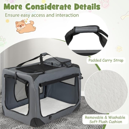 With a size of 61 cm × 43 cm × 43 cm/72 cm × 52.5 cm × 52.5 cm/84 cm × 58 cm × 58 cm/91 cm × 64 cm × 64 cm(L × W × H), the dog crate is suitable for small/medium/large dogs. The retractable spring metal frame allows the collapsible dog crate to set up and collapse quickly without any tools. A reinforced metal structure combined with 600D Oxford fabric helps the soft side dog kennel stay upright and hold its form, while strengthened corners reduce drooping when your pet shifts or leans. Also, there are more considerate details. Featuring 3-door design & 5-sided ventilation, the portable pet kennel with self-locking zippers ensure easy access and interaction while helping deter escapes. A lightweight design with padded carry strap support makes the portable pet kennel comfortable to transport. Also, 2 removable storage pockets keep treats and travel paperwork neatly together for errands, hotels, and road trips. 30 S Quick Assembly & Folding: Thanks to an innovative retractable spring metal frame, the portable dog kennel sets up and folds down in about 30 seconds with no tools. It can be folded into a slim size that can be put neatly into car trunks, RV storage, or a quiet corner at home. Sturdy & Long-lasting Structure: The collapsible dog crate is built with a sturdy metal frame and rugged 600D Oxford cloth for dependable structure. Reinforced corners help it stay stable when pets shift positions against the sides. And the suggested weight is up to 11 kg/16 kg/23 kg/32 kg. Secure & Pet-friendly Design: The soft side dog kennel uses 5-sided mesh to offer breezy ventilation and clear visibility, which can help reduce pet anxiety. 3 openings with self-locking zippers provide easy entry while helping prevent escapes. A removable and washable fleece cushion creates a comfy and clean space for your furry friends. Easy Transport & Smart Storage: The folding soft pet crate stays lightweight for easy transport, and the padded carrying strap helps reduce hand strain. 2 removable storage pockets keep supplies organized, which keeps travel calmer for both pets and owners. Choose the Right Fit: Measuring 61 cm × 43 cm × 43 cm/72 cm × 52.5 cm × 52.5 cm/84 cm × 58 cm × 58 cm/91 cm × 64 cm × 64 cm(L × W × H), the foldable dog travel crate is suitable for Small/Medium/Large dogs and cats. Please make sure the size of your pet before purchasing.(Length: From the tip of the nose to the base of the tail; Height: From the head to the floor) Specification: Color: GrayMaterial: Mesh, Metal, Oxford loth, Rabbit FurPV10551GR (S)Product Dimension: 61 cm × 43 cm × 43 cm(L × W × H)Folded Dimension: 61 cm × 43 cm × 7.5 cm(L × W × H)Mat Size: 59 cm × 41 cm(L × W)Side Door Size: 46 cm × 30 cm(L × W × H)Net Weight: 3 kgMaximum Weight: 11 kgPV10552GR (M)Product Dimension: 72 cm × 52.5 cm × 52.5 cm(L × W × H)Folded Dimension: 72 cm × 52.5 cm × 8.5 cm(L × W × H)Mat Size: 68 cm × 48.5 cm(L × W)Side Door Size: 53 cm × 33 cm(L × W × H)Net Weight: 3.5 kgMaximum Weight: 16 kgPV10553GR (L)Product Dimension: 84 cm × 58 cm × 58 cm(L × W × H)Folded Dimension: 84 cm × 58 cm × 10 cm(L × W × H)Mat Size: 83 cm × 54 cm(L × W)Side Door Size: 65 cm × 40 cm(L × W × H)Net Weight: 4 kgMaximum Weight: 23 kgPV10554GR (XL)Product Dimension: 91 cm × 64 cm × 64 cm(L × W × H)Folded Dimension: 91 cm × 64 cm × 9 cm(L × W × H)Mat Size: 88 cm × 60 cm(L × W)Side Door Size: 76 cm × 41 cm(L × W × H)Net Weight: 4.5 kgMaximum Weight: 32 kgBox QTY: 1(May vary by batch)Is Assembly Required: Yes Package Includes: 1 × Foldable Pet Crate1 x Fleece Bed1 × Instruction
