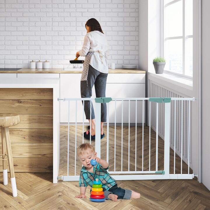 Baby gates extra wide with 3 extensions can adjust from 70 cm to 119 cm , which can let you block off stairways, bedroom doors, hallways, and other off-limit areas inside your home for better children or pets safety. The child gate is equipped with the walk-in door with double lock lever handles, allowing adults to pass easily. What's more, this baby safety gate comes with an auto-close function, which can be easily opened by one-handed operation, free to go through from both sides. Features with pressure mount design, there is no need to drill or extra tools that you can easily set up the stair gates for kids. Please note that there will be a gap between the gate latch before installation. This gap will be eliminated once installed. Bullet Point: Extra-Wide Gate: Expands to fit openings between 70-119 cm wide with 3 extensions and reaches to 76 cm height, baby safety gate is ideal for doorways, hallways and stairways to protect children and small pets. Kid-Safe Dual Lock: Designed with a pull and lift locking system, our extra wide baby gate can be easily opened by grown-ups but difficult for baby, which keeps your little one away from accident. Auto-Close Dual Opening: The walk through baby gate is equipped with an auto-close function, which will close itself once open less than 90° to prevent kids or pets sneak in. Moreover, the dual-direction opening design makes it convenient to go in and out. Kid-Safe Dual Lock: Designed with a pull and lift locking system, our extra wide baby gate can be easily opened by grown-ups but difficult for baby, which keeps your little one away from accident. Wall-friendly Installation: Without damaging walls or surfaces, there are adjustable pressure screws on this child gate for quick installation, no additional tools or drilling required. Features: Supports a two-way swing, allowing parents easily go in and out Dual-lock safety design, pull and lift locking system for baby safety Pressure mount enables easy assembly without damaging the wall Single-hand operation, convenient for parents while holding babies in one hand Extra-wide gate coverage, 70-119 cm extension for doorways, hallways and stairways Strong metal structure with walk through door, which is strong enough to hold the shaking Auto-close function to add hands-free convenience, close automatically once open less than 90° Specifications: Material: Iron+ABS+Nylon Product Dimension: 70-119 cm x 2 cm x 76 cm (L x W x H) Net Weight: 6 kg Package Includes: 1 x Wrench 3 x Extension 1 x Baby Gate 1 x Instruction Box Qty:1(May vary by batch) Is Assembly Required: Yes