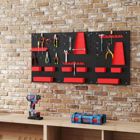 This tool storage set includes 9 bins, 4 hammer racks, a 30-slot screwdriver holder, 2 wrench racks, 2 7-slot screwdriver holders and 16 hooks for organized working space. The customizable layout with regularly arranged holes will satisfy your multiple demands. Moreover, the easy-to-mount design utilizes vertical space brilliantly, making it ideal not only for garages and workshops but also for enhancing organization in studies or craft areas. Elevate your organizing game and enjoy a clutter-free environment with this well-crafted pegboard. Bullet Point: Rich Accessories: The wall organizer comes with multiple tool holders: 3 large bins, 6 small bins, 4 hammer racks, a 30-slot screwdriver holder, 2 wrench racks, 2 7-slot screwdriver holders and 16 hooks, designed to meet diverse storage needs. Well-Selected Material: The 9 storage bins of this utility tool kit are made of premium PP with no bad smells. The 3 pegboards and other accessories are constructed of heavy-duty metal which is plastic-sprayed for long-lasting use. Customizable Layout: Equipped with regularly arranged holes on the pegboard, this setup allows for versatile placement of accessories, enabling you to configure your storage layout according to specific requirements. Space-Saving Design: With pre-drilled mounting holes, this tool storage board can be easily mounted on any wall, efficiently utilizing vertical space and reducing clutter in your garage or workshop. Not Just for Tools: Beyond organizing tools, this wall-mounted storage organizer is perfect for use in study, art studio or craft area, making it a versatile solution for sorting a variety of items. Specification: Color: Black + Red Material: Metal, PP Overall Dimension: 120 x 60 x 2 cm (L x W x Thickness) Inner Size of Small Bin: 11 x 8 x 5 cm (L x W x H) Inner Size of Large Bin: 23.5 x 9 x 5 cm (L x W x H) Net Weight: 7 kg Is Assembly Required: Yes Box Qty: 1(May vary by batch) Package Includes: 3 x Pegboards 3 x Large Bins 6 x Small Bins 4 x Hammer Racks 1 x 30-Hole Screwdriver Holder 2 x Wrench Racks 2 x 7-Slot Screwdriver Holders 16 x Hooks 1 x Instruction
