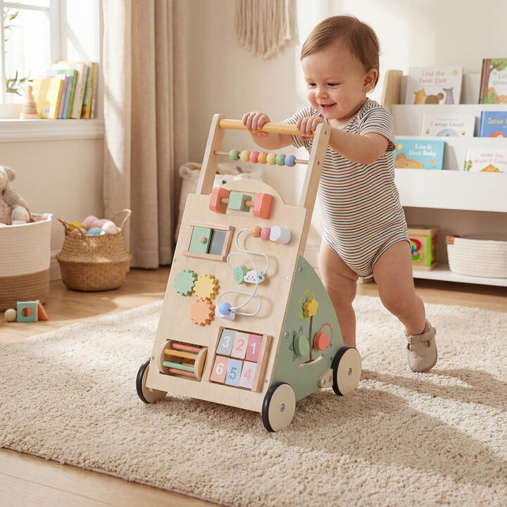 Featuring 10 engaging activities, such as a clock, shape sorter, counting beads, bead maze, and more, this wooden baby walker fosters storytelling, problem-solving, and hands-on discovery. The stable triangular structure, and rounded edges ensure a safe, sturdy experience. Ideal for birthdays, holidays, or baby showers, this multifunctional push walker inspires creativity, develops motor skills, and encourages active play, making it a cherished gift for growing kids and delighted parents. Multifunctional Design: This baby walker and activity center combines imaginative play with movement, keeping little ones engaged for hours. Back storage space provides room for favorite toys, while the smooth handle and anti-slip wheels offer a steady, comfortable grip for every step. Various Engaging Activities: 10 engaging games include a clock, shape sorter, counting beads, sliding block, peek-a-boo mirror, rotating gears, bead maze, rolling drum, rotating blocks, and a tracking game. Little fingers love manipulating moving parts, while bright colors and fun shapes invite kids to invent stories and puzzles as they play. Educational Entertainment: Designed to unlock hands-on ability, this wooden baby walker can improve focus and attention, inspire imagination, stimulate creativity, accelerate motor development, and develop body awareness through captivating activities. Stability & Safety: The stable triangular structure with safe rounded edges and secure bolted connection ensures a sturdy, reliable play experience. This montessori walking toy complies with EN71 and CPSIA, so you can trust your kid to enjoy active hours of fun with peace of mind. Perfect Gift for Little Ones: This baby push walker's vibrant look and activity-packed features make it an unforgettable gift choice for birthdays, holidays or baby showers, delighting both children and parents with its lasting quality and imaginative possibilities. Specification: Color: ColorfulMaterial: WoodOverall Dimension: 34 cm x 32 cm x 55.5 cm (L x W x H)Suitable Age: 1+ years oldNet Weight: 2.5 kgBox QTY: 1(May vary by batch)Is Assembly Required: Yes Package Includes: 1 x Baby Walker1 x User Guide