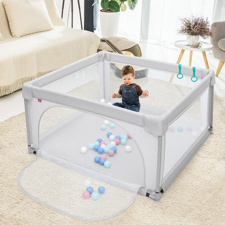 A premium baby playpen is a great option! The playpen for toddlers has been carefully designed to provide a safe play area for your child. Made of a durable steel frame, covered with oxford cloth, and padded with a thick sponge, the toddler playpen is wear-resistant, tear-resistant, and safe for anti-collision, kid-friendly material to climb, touch, or even bite. In addition, the stable structure with stable suckers prevents tipping and accidental movement; the visible side panels with zippered doors allow children to see their mothers from different sides, whether they are sitting or lying down. This will make them feel safe and you can interact with them anytime. A baby playpen is a practical tool and helper for parents who need more free time and babies who need a lot of space to play! If you are looking for a product like this, do not hesitate to place an order! Bullet Point: Perfect Size Play Area and Scientific Height: The baby playpen the dimensions of 120 x 120 x 68cm, and provides enough safe playing space for the baby. It's perfect for a compact room or travelling to use. The height of the fence is high enough for the baby to stand and walk while having enough area inside the playpen to explore around. Safe Material and Sturdy Structure: The baby mesh playpen is constructed of a durable steel frame and Waterproof Oxford cloth cover, and filled with a thick sponge which can effectively reduce the impact of accidental bumping and protect the baby from injury. In addition, the non-slip suction cups on the bottom of the panel make it difficult to tip over and move. Breathable Mesh Panels with the Zipper: The breathable mesh side panels allow parents to attentively observe the baby's actions and interact with him/her at any time to give your baby a sense of security. The considerate external zipper opening design effectively prevents babies from running outside and falling accidentally. Parent's Litter Helper: With the help of baby Playard, parents don't need to look after their babies all the time and they will have more time to do their own business. At the same time, babies can develop their awareness of independence at an early date or play with friends and are surrounded by colourful ocean balls (50 balls included) for extra fun. Easy to Setup and Maintain: The playpen is portable and easy to set up so that it can turn anywhere into a safe play space to keep your baby away from harm while you can free your hands to get other things like housework going on. The whole fabric is removable and easy to wipe down with a damp cloth and soap to keep it fresh and sanitary. Feature: The Oxford fabric fence with steel posts is durable 50 balls and 4 pull rings are included with the product Creates a large field for various activities Suction cups on the base improve stability Scientific height is suitable for learners to walk The large entrance is useful for easy access The fence can be easily assembled and disassembled Specifications: Colour: Grey / Light Blue / Multi colour Material: Oxford cloth, steel, sponge Overall Dimension: 120cm x 120cm x 68cm (L X W X H) Net Weight: 4 kg Applicable Age: 10 months – 6 years old Package Includes: 1 x Baby playpen 50 x Ocean ball 1 x Instruction manual Box Qty:1(May vary by batch)