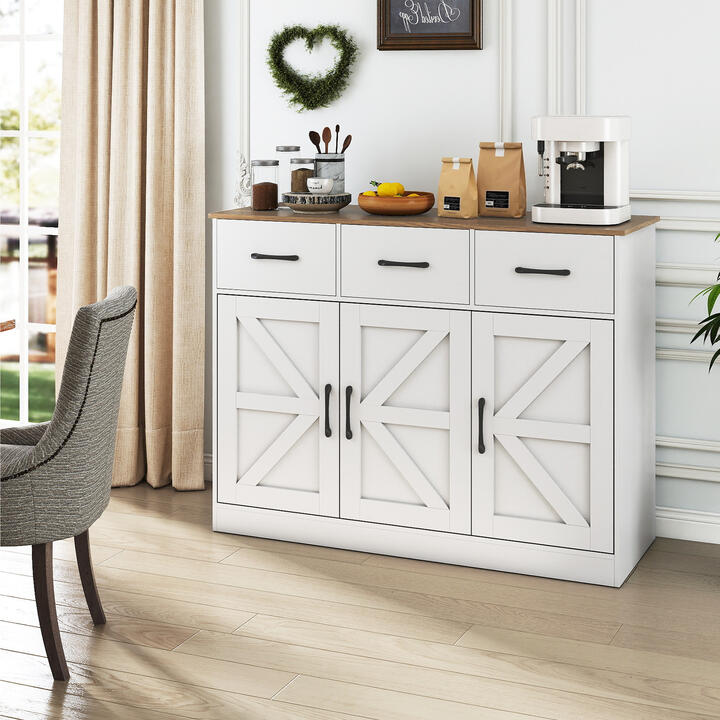 This farmhouse sideboard combines charm and practicality, offering large storage capacity with 3 handy drawers, 2 spacious cabinets, and a wide surface perfect for display or serving. Inside, 2 adjustable and removable shelves provide flexible customized storage space for different dining essentials. Safety comes first, the kitchen buffet features a reinforced base, 2 anti-tipping kits, and protective foot pads. Its timeless design brings warmth and character, making it a standout piece in any room. Whether used as extra storage in the dining area, a decorative accent in the living room, or a functional organizer by the entryway, this versatile storage cabinet adapts effortlessly to your home’s style and requirements. More well-made details await your discovery. Bullet Point: Spacious Storage Solution: Featuring a generous wide top, 3 practical drawers, and 2 enclosed cabinets, this buffet cabinet offers excellent storage versatility for your home. Its functional design keeps your space tidy and clutter-free. Customizable Adjustable Shelves: Equipped with 2 shelves that are both 5-position adjustable and easily removable, the sideboard cabinet adapts to your ever-changing storage needs and makes your storage more efficient. Enhanced Stability & Durability: Designed for safety and peace of mind, the the wood kitchen cabinet features an enlarged base and includes 2 anti-tipping kits to securely anchor the unit. Its protective foot pads also protect the floor from scratches. Timeless Rustic Farmhouse Charm: Showcasing a classic rustic farmhouse design, this coffee bar cabinet adds warmth and character to any interior. The blend of natural textures and charming details creates an inviting focal point. Versatile Multi-Scene Functionality: Whether you need extra storage in your dining room, a stylish accent in your living room, or a practical organizer for your entryway, this buffet cabinet fits perfectly in any setting. Features: Countertop, 3 drawers, 2-door cabinet, and single-door cabinet for ample storage Dual 5-level adjustable shelves to ensure flexible storage solutions 2 anti-tipping kits prevent sudden tipping over Equipped with magnetic catches to ensure enclosed storage space Metal drawer slides for smooth drawer operation Provide a comfortable grip with the metal drawer handles Protective foot pads avoid scratching the floor Designed with an enlarged base that promotes overall stability Farmhouse design makes it a centerpiece for your dining areas Note: The buffet cabinet requires assembly Specifications: Color: Rustic Brown/White & Natural Material: Engineered Wood, MDF Overall Dimensions: 42.5” x 15” x 32”/108 x 38 x 81 cm (L x W x H) Inner Size of Each Drawer: 11.5” x 11.5” x 4”/28.5 x 28.5 x 10.5 cm (L x W x H) Inner Size of Big Cabinet: 27” x 13.5” x 21”/68.5 x 34.5 x 53.5 cm (L x W x H) Size of Big Shelf: 27” x 13”/68.5 x 32.5 cm (L x W) Inner Size of Small Cabinet: 13” x 13.5” x 21”/33.5 x 34.5 x 53.5 cm (L x W x H) Size of Small Shelf: 13” x 13”/33.5 x 32.5 cm (L x W) Adjustable Shelf Spacing: 1.3”/3.2 cm Load Capacity of Cabinet Top: 100 lbs/45 kg Load Capacity of Each Drawer: 35 lbs/15 kg Load Capacity of Each Shelf: 35 lbs/15 kg Load Capacity of Each Cabinet: 45 lbs/20 kg Net Weight: 72 lbs/33 kg Box QTY: 2(May vary by batch) Is Assembly Required: Yes Package Includes: 1 x Buffet Cabinet 1 x User Guide