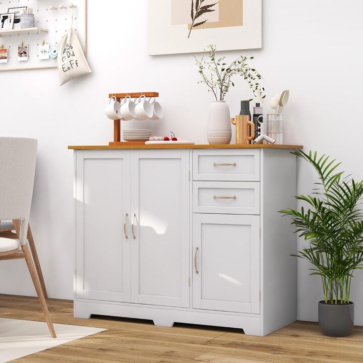 Wanna add extra storage space to keep your home clean and organized? Wanna an elegant cabinet to match your modern home style? The buffet storage sideboard will be a great choice for you! The stylish sideboard is the combination of a countertop, cupboard, and storage drawers. It features classified and multi-layer storage areas to store a variety of items and add charm to your room. The adjustable shelf of the door cabinet provides customized storage space for different sizes of items. The cabinet has sturdy construction with a stable base for safety. Especially, rustproof hinges, magnetic suctions, and exquisite hardware handles are all our functional highlights and features to provide enhanced convenience. This sideboard buffet can be used in various ways, acting as a buffet cabinet in your dining room for tableware, a storage cabinet for books, shoes or a storage console for home decor. BulletPoint: Large Storage Space: The storage cabinet features a tabletop, a 2-door cabinet, a corner door, and two drawers to provide great convenience to store stuff in different sizes. You can display plants and ornaments on the large tabletop, and put tableware, wine glasses, and necessities in the cabinets to reduce dust coverage. Keys and small items can keep in the drawers. Shelf with 3-Height Adjustment: The shelf inside the large 2-door cabinet can be adjusted to 3 heights, which greatly gives you the freedom to change the space layout based on the size of your items. You can store suitable tableware, wine bottles, handcrafts, and other items to fulfill your requirements. The shelf can withstand 10kg. Durable Material and Stable Base: The sideboard buffet table is made of P2 MDF board with wood veneer, durable, dampness-resistant, deform-proof, and easy to wipe. The front bottom raised bases avoid touching the ground directly to protect the stuff inside the cabinet. The design of the feet forms sturdy support to ensure reinforced stability. Easy Pulling Drawers with Stylish Handles: The 2 drawers with smooth sliders are designed for easy pulling and pushing. And the stylish silver handles make the buffet cabinet more unique and luxurious. In addition, we focus on superior details, rustproof hinges and magnetic suctions, convenient for you to open and close the door. Multifunctional and Elegant Sideboard: The delicate wood grain tabletop combines with a white finish to create a sense of elegance to match well with any of home styles and various occasions. The buffet sideboard is multifunctional and practical for your kitchen, bedroom, entryway, or hallway to be used as a storage cabinet, cupboard, console table, etc. Specifications: Color: White+Brown Material: P2 MDF Overall Dimension: 110cm x 40cm x 78cm(L x W x H) Tabletop Capacity: 50kg Single Drawer Capacity: 5kg Net Weight: 29kg Package includes: 1 x Sideboard Buffet Cabinet 1 x Manual Box Qty:1(May vary by batch)