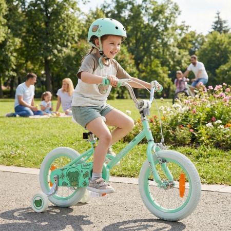 Specially crafted for young riders, this stylish bike combines fun and function, making every trip memorable. Adjustable height makes it ideal for 3-5/4-7 years old kids. The fully enclosed chain guard protects kid's feet. Front and rear reflectors make children visible in low-light conditions, keeping them safer during dusk rides or cloudy days. The bike bell adds extra fun to each journey. Additionally, with 2 detachable training wheels, the kids bike is perfect for children learning to ride. The high-quality tires ensure a safe and steady riding experience on flat surfaces. More importantly, it has AS/NZS 1927 and CPN No.6 of 2004 certification for higher security. Bullet Point:Convenient to Adjust Height: The kids bicycle comes with adjustable handlebar and seat for you to effortlessly adjust the height as your child grows. Height-adjustable design ensures a comfortable riding experience and helps maintain the perfect fit for your little one, making it a long-lasting gift that adapts to your child's changing needs.Dual Brake System for Safe Riding: The front handbrake makes it convenient to brake with a shorter grip distance, while handy coaster brake makes it quick to stop the bike by pedaling backward. Fully enclosed chain guard also prevents kids' feet from getting pinched.Premium Tires & Training Wheels: The children bike comes with high-quality rubber tires that provide smooth rides on various grounds. Detachable training wheels offer extra stability for beginners, helping your child develop balance and confidence while learning to ride, and can be removed as they become more skilled.Ideal Riding Choice for Children: Designed for boys and girls ages 3-5/4-7 years old, the kids bicycle features lovely patterns and a fun bell, delighting young riders. Moreover, the front and rear reflectors keep your little one visible to add more safety. It also has AS/NZS 1927 and CPN No.6 of 2004 certification.Pre-assembled Design for Quick Use: Pre-assembled design makes installation a breeze. The finished size is 101 x 50 x 70-73 cm/114 x 54 x 75-78 cm (L x W x H). The inseam size is 48-53 cm/53-61 cm. Note: Please measure kid's INSEAM and compare with SADDLE HEIGHT to check if the rider can touch the ground. Specification:Color: Green/ PinkMaterial: Metal, PP, TRP, PVC14InchProduct Dimensions: 101 x 50 x 70-73 cm (L x W x H)Saddle Height: 50-55 cmSuitable Age: 3-5 Years OldSuitable Height: 95-110 cmInseam Size: 48-53 cmWheel Size: 35 cmWheelbase: 67 cmWeight Capacity: 65 kgNet Weight: 9 kgGross Weight: 11 kgBox QTY: 1(May vary by batch)Is Assembly Required: Yes 16InchProduct Dimensions: 114 x 54 x 75-78 cm (L x W x H)Saddle Height: 55-63 cmSuitable Age: 4-7 Years OldSuitable Height: 105-130 cmInseam Size: 53-61 cmWheel Size: 40 cmWheelbase: 74 cmWeight Capacity: 65 kgNet Weight: 10 kgGross Weight: 12 kgBox QTY: 1(May vary by batch)Is Assembly Required: Yes Package Includes:1 x Kids Bicycle1 x User Manual