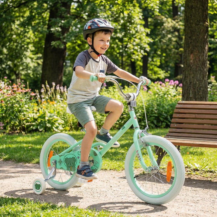 Specially crafted for young riders, this stylish bike combines fun and function, making every trip memorable. Adjustable height makes it ideal for 3-5/4-7 years old kids. The fully enclosed chain guard protects kid's feet. Front and rear reflectors make children visible in low-light conditions, keeping them safer during dusk rides or cloudy days. The bike bell adds extra fun to each journey. Additionally, with 2 detachable training wheels, the kids bike is perfect for children learning to ride. The high-quality tires ensure a safe and steady riding experience on flat surfaces. More importantly, it has AS/NZS 1927 and CPN No.6 of 2004 certification for higher security. Bullet Point:Convenient to Adjust Height: The kids bicycle comes with adjustable handlebar and seat for you to effortlessly adjust the height as your child grows. Height-adjustable design ensures a comfortable riding experience and helps maintain the perfect fit for your little one, making it a long-lasting gift that adapts to your child's changing needs.Dual Brake System for Safe Riding: The front handbrake makes it convenient to brake with a shorter grip distance, while handy coaster brake makes it quick to stop the bike by pedaling backward. Fully enclosed chain guard also prevents kids' feet from getting pinched.Premium Tires & Training Wheels: The children bike comes with high-quality rubber tires that provide smooth rides on various grounds. Detachable training wheels offer extra stability for beginners, helping your child develop balance and confidence while learning to ride, and can be removed as they become more skilled.Ideal Riding Choice for Children: Designed for boys and girls ages 3-5/4-7 years old, the kids bicycle features lovely patterns and a fun bell, delighting young riders. Moreover, the front and rear reflectors keep your little one visible to add more safety. It also has AS/NZS 1927 and CPN No.6 of 2004 certification.Pre-assembled Design for Quick Use: Pre-assembled design makes installation a breeze. The finished size is 101 x 50 x 70-73 cm/114 x 54 x 75-78 cm (L x W x H). The inseam size is 48-53 cm/53-61 cm. Note: Please measure kid's INSEAM and compare with SADDLE HEIGHT to check if the rider can touch the ground. Specification:Color: Green/ PinkMaterial: Metal, PP, TRP, PVC14InchProduct Dimensions: 101 x 50 x 70-73 cm (L x W x H)Saddle Height: 50-55 cmSuitable Age: 3-5 Years OldSuitable Height: 95-110 cmInseam Size: 48-53 cmWheel Size: 35 cmWheelbase: 67 cmWeight Capacity: 65 kgNet Weight: 9 kgGross Weight: 11 kgBox QTY: 1(May vary by batch)Is Assembly Required: Yes 16InchProduct Dimensions: 114 x 54 x 75-78 cm (L x W x H)Saddle Height: 55-63 cmSuitable Age: 4-7 Years OldSuitable Height: 105-130 cmInseam Size: 53-61 cmWheel Size: 40 cmWheelbase: 74 cmWeight Capacity: 65 kgNet Weight: 10 kgGross Weight: 12 kgBox QTY: 1(May vary by batch)Is Assembly Required: Yes Package Includes:1 x Kids Bicycle1 x User Manual