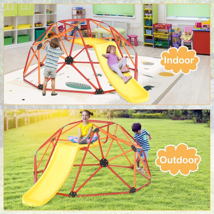 This climbing dome with slide is a perfect activity center for 3-10 years old kids to crawl, climb and slide. It can be used in your jungle gym, backyard, garden, park and more to improve kids' motor skills, social skills, balance ability, hand-feet coordination and critical thinking. Plenty of steel pipes consist of the whole frame and weather-resistant fabric consists of the platform for long-term use. And the whole playground can withstand a weight up to 150kg, which holds up to 3 kids at the same time. Besides, to add more security, there are safety handrails and rounded edges. Extra ASTM and CPSIA certifications add excellent security. BulletPoint: Multi-purpose Climbing Dome with Slide: This climbing dome and play set includes a geometric dome climber for kids to crawl or climb and a smooth slide for kids to enjoy sliding fun. Besides, measuring 241.5 cm x 183 cm x 90 cm (L x W x H) , this fun activity center can accommodate 3 kids to play together, helping your little ones to have fun with their friends.Extra Weather-resistant Fabric Platform: We also design the dome climber with a premium fabric platform, which is sun-proof, water-proof and fade-resistant. Your little one can sit or stand on the platform. Additionally, the platform is also of great tear resistance and weather resistance, making it more suitable for outdoor use.Stable Structure with High Load Capacity: Made of powder-coated steel pipes, our climbing dome set ensures long-lasting service life and outstanding stability after setup. The whole play set bears a weight up to 150kg. And heavy-duty steel frame makes it rust-proof, abrasion-resistant and wear-resistant, which can serve your kids for years.More User-friendly and Secure Details: Safety handrails on both sides of the slide ensures kids' safety when they slide. Smooth corners and edges create a safe playing area for all children. What's more, it also has passed ASTM and CPSIA certification for much more security. Ideal Activity Center for Your Kids: This playground will be an ideal festival or birthday gift for 3-10 years old. It can not only bring kids endless fun and burn their energy to free parents, but is also great for children's motor skills, balance ability, hand-feet coordination and critical thinking. Features: Contains 1 large dome climber, 1 smooth slide and 1 fabric platformHigh-quality fabric of the platform for great sun resistance and water resistanceRust-resistant steel frame for long-term use and excellent sturdinessSmooth edges and safety handrails of slide for safe useASTM and CPSIA certification for more stability and safetySuitable for children's motor skills, social skills, balance ability, hand-feet coordination and critical thinkingFun and attractive climber for 3-10 years old kidsPerfect activity center for jungle gym, backyard, garden, park and more Specifications: Colour: As Pictures Show Material: Steel + Fabric Overall Dimension: 241.5 cm x 183 cm x 90 cm (L x W x H) Suitable Age: 3-10 Years Old Load Capacity of the Platform: 50 kg Load Capacity of the Slide: 50 kg Load Capacity of the Dome Climber: 150 kg Net Weight: 23 kg Package includes: 1 x Dome Climber 1 x Slide 1 x Fabric Platform 1 x User Manual Box Qty:1(May vary by batch)