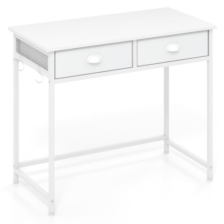 The study desk includes 2 fabric drawers and flexible hanging hooks for convenient storage of essentials like stationery and backpacks. Unlike flimsy desks, the computer desk is crafted with a sturdy metal frame that can support up to 111kg. Its compact 90cm size makes it ideal for small spaces. With premium features like adjustable foot pads for uneven floors, a comfortable footrest for leg stretching, and elegant shell-shaped metal handles for seamless drawer operation, this home office desk combines practicality with elegance for a truly versatile and efficient workspace. Bullet Point: Dual Fabric Drawers: The computer desk features 2 fabric drawers that are designed for all your essentials, from stationery to documents, making decluttering a breeze. Besides, they can easily be removed and folded away as needed. Flexible Hanging Hooks: The 4 hooks of the study desk provide a smart solution for keeping your backpacks and headphones accessible. In addition, the flexibility to rearrange them as needed allows for optimal utilization of space. Optimal Sturdiness and Longevity: The robust metal frame supports up to 111kg and ensures a solid foundation for your writing and other creative projects. In addition, the home office desk features adjustable foot pads that adapt to the uneven floor. Compact and Versatile Choice: Ideal for small spaces, the 90cm vanity table perfectly fits in various settings, such as living rooms, bedrooms, or studies. For more convenience, the table enhances functionality without occupying excessive space. More Premium Details: The well-crafted writing desk comes with a 10cm high footrest for leg stretching convenience. Moreover, the desk is designed with shell-shaped metal handles that looks elegant while ensuring easy drawer operation. Features: Powder-coated metal structure offers reliable support and optimal longevity Foldable fabric drawers are easy to set up and offer additional storage 4 detachable hanging hooks keep your backpack or headphone within reach Designed with a 10cm high footrest that better relaxes your legs Metal handles with a shell shape looks delicate and elegant Promotes overall stability with the adjustable foot pads Spacious legroom enables you to freely stretch legs 90cm computer desk is space-saving for living rooms, studies, and bedrooms Specifications: Color: Rustic Brown and Black/White Material: Metal, Engineered Wood Overall Dimensions: 90 x 45 x 75 cm (L x W x H) Size of Legroom: 82 x 59 cm (L x H) Inner Size of Each Drawer: 40.5 x 39 x 9.5 cm (L x W x H) Load Capacity of Tabletop: 91 kg Load Capacity of Each Drawer: 10 kg Net Weight: 10 kg Package Includes: 1 x Study Desk 1 x User Guide Box Qty:1(May vary by batch)