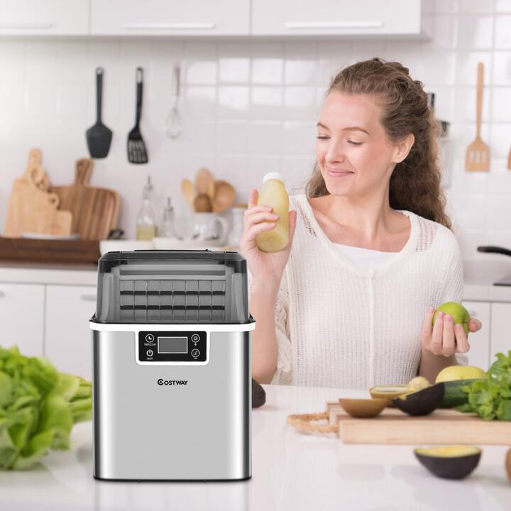 Cool you summer with our countertop ice making machine! It has a special support seat, enabling you to place 5L (max) of water bottle (not included) on the top to constantly add water into the 3.2L water tank. Directly adding water via the water inlet hole will also work. Through a Nickle Brass compressor, this ice maker can produce pure and high hardness square ice 24 pcs per cycle and 20KG per day. You can adjust the thickness of the ice cube by controlling the condensation time. And his ice maker has practical auto self cleaning for convenient daily maintenance. An LCD control panel is easy to operate and has water shortage and ice full indicator for safe use. Featuring a 24H timer, you can set the time for reservation. The ice-making time can be delayed for 8H. BulletPoint: 2 Ways of Adding Water: Simply add water through the top water inlet, or place bottled water (not included) on the supporting seat auto-adding water to the 3.2L water reservoir. Made of stainless steel, this machine is durable and strong enough to hold bottled water of 5L max. In addition, the water inlet has a lid for dust-proof. High-Efficiency Ice Making Machine: This ice maker produces 24 pcs of ice cube every 14 mins, which means you’ll have 20KG ice yield per day. With a 1.2KG ice storage capacity, this ice machine is enough to cater to a group of people for parties or coffee shops. Besides, this ice maker is suitable to place on countertops, kitchen islands to save valuable tabletop spaces. Crystal-Clean Square Ice Cube: To form pure and crystal-clean square ice cubes, this ice-making machine uses the Nickle Brass compressor. And you can directly see the ice-making process from the transparent cover. In addition, you can increase and reduce the ice-making time (±6 mins top) to adjust the thickness of the ice cube. Reservation Function and Auto Self-Cleaning: Press the “Timer” button for more than 5 seconds and enter the 20 mins of self-cleaning. Moreover, it also features a drainage hole to help fast empty the melting water. You can even reserve the ice making time, and an 8H delay is possible. Safe Operation with LCD Control Panel: The control panel is easily understandable and has clear indicating icons on the LCD screen, especially ice full and water shortage. When the ice is full, the ice machine will stop to avoid excessive production. We also throw in a free ice scoop to move the ice cubes. And it makes sound less than 42 DB. Features: Use the water dispenser to add water or directly add water through the inlet hole. 7.5-19L of bottled water (not included) adaptable Stainless steel and PP material built up a durable ice maker body The transparent lid allows you to see the ice-making process clearly. Daily yield 20KG, one cycle of 14 minutes, 24 pcs per cycle, ice storage of 1.2KG Compact for kitchen and office countertops Produce high quality and clean square ice Ice making time adjustable (±6 minutes top) to change the thickness of the ice cube A 20-minute self-cleaning function makes your life easier A drainage hole under the bottom to drain out the melting water Ice full indicator, the ice maker will stop until you remove the ice Set up 1-24H of timer to save electric bill Has LCD control panel for easy operation Removable ice basket and additional ice scoop Rubber sucker to stabilize the ice maker, sound is lower than 42 DB Real-time ice maker allows making ice by appointment (delay up to 8 hours) Specifications: Color: Silver Material: Stainless Steel, PP Product Dimensions: 26 x 36 x 38 cm (L x W x H) Power: 220-240V, 50Hz Refrigerant: R290 32g Ice Yield per Day: 20kg per Day Ice Shape: Square Ice Making Cycle: 14-20 min Ice Storage Capacity: 1.2kg Net Weight: 10kg Package Includes: 1 x Ice Maker 1 x Ice Scoop 1 x Ice Basket 1 x Instruction Box Qty:1(May vary by batch)